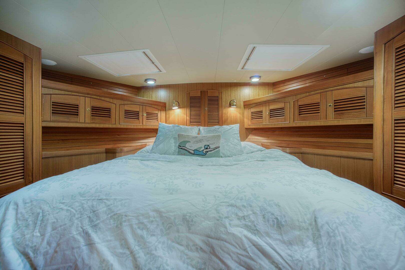 Forward is the VIP stateroom with queen island berth, two cedar lined hanging lockers, teak storage cabinets port and starboard and large drawer storage beneath the berth and flat screen TV. The VIP has it's own large ensuite head with upgraded Vacuflush head and separate walk in shower, granite counter tops and rich teak cabinetry.