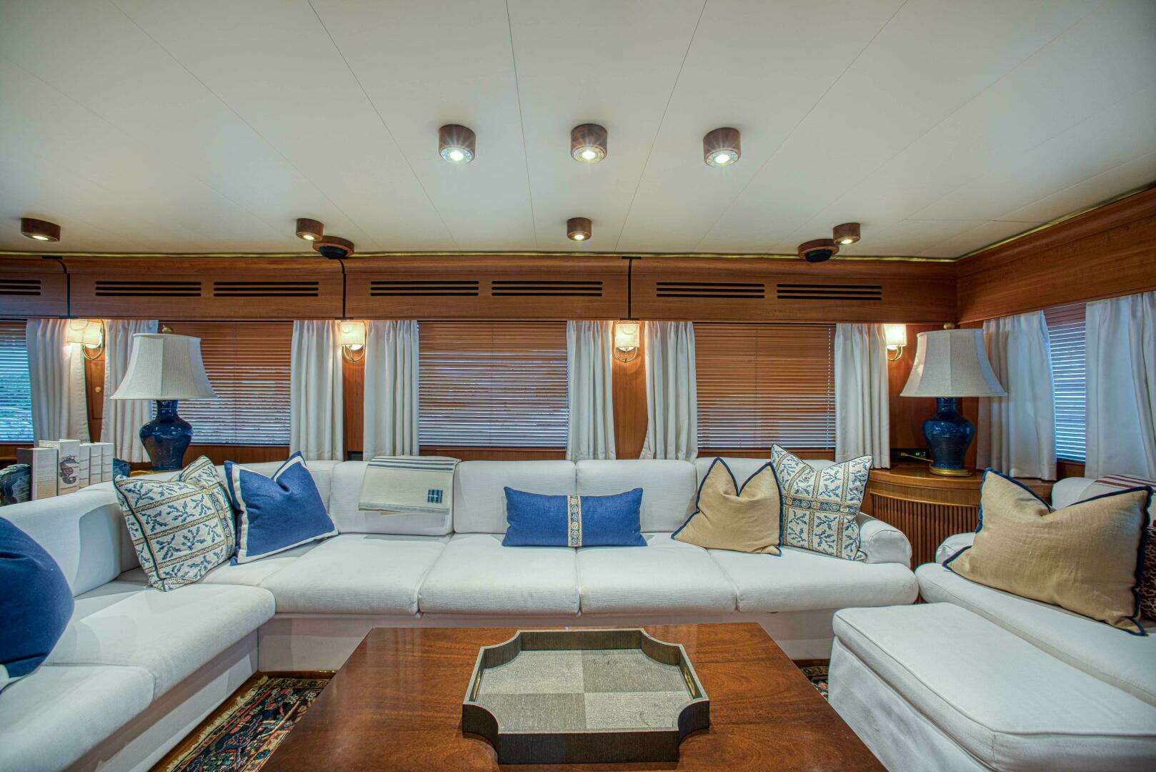Beautiful teak and ebony sole. To starboard is a large built in "U" shaped sofa with storage underneath and paired with generous sized coffee table. Forward of the seating area is a desk and office area followed by the private entrance to the master stateroom.