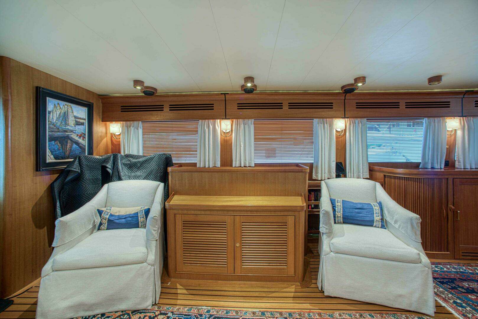 The port side has the large tv and two comfortable chairs. The floor is beautiful Teak and Ebony solid wood in a satin finish.
