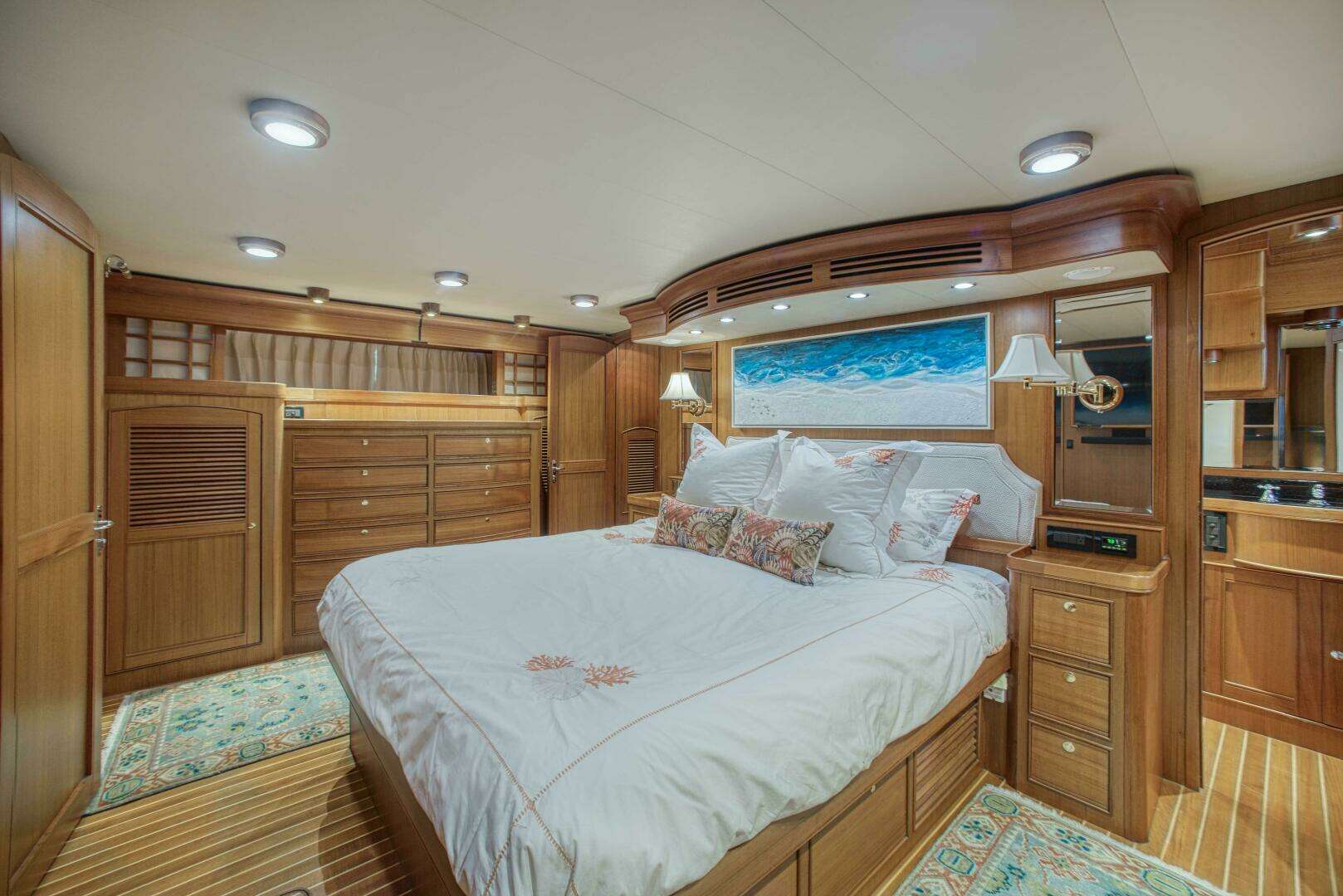 The full beam master suite is aft with king sized center line bed, four cedar lined closets, built in teak cabinets and chest of drawers to starboard and a large vanity to port. Extra features include a large Sentry safe, Shoji shades for privacy, and a flat screen TV. Aft to starboard is a private entrance from the master suite to the salon. Aft to port is the large owners head complete with granite counters, rich teak cabinetry throughout, upgraded Vacuflush head, bidet and a large walk in shower with full length built in bench seat.