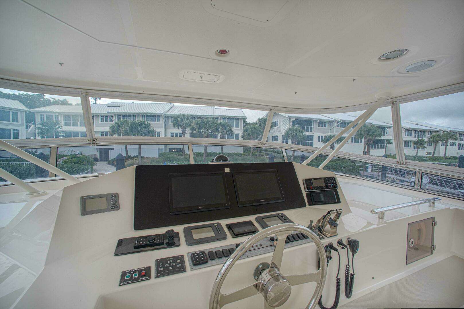 The flybridge is an excellent helm station and spacious entertaining area. There is an enclosure protecting you from the wind and spray and you have great visibility from this position. Most prefer to be up there in tight quarters due to the increased visibility the added height provides. There are 2 upgraded Garmin Screens forward and a newer Garmin Radar.