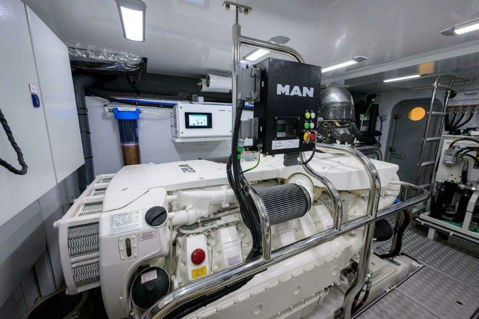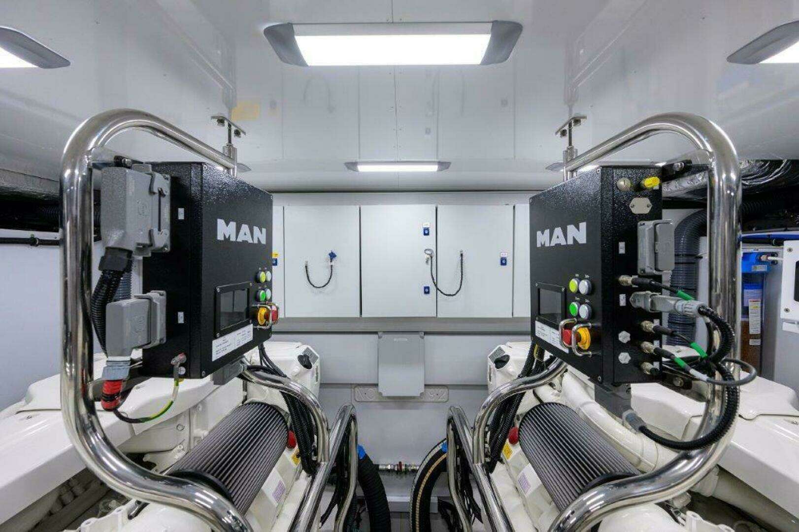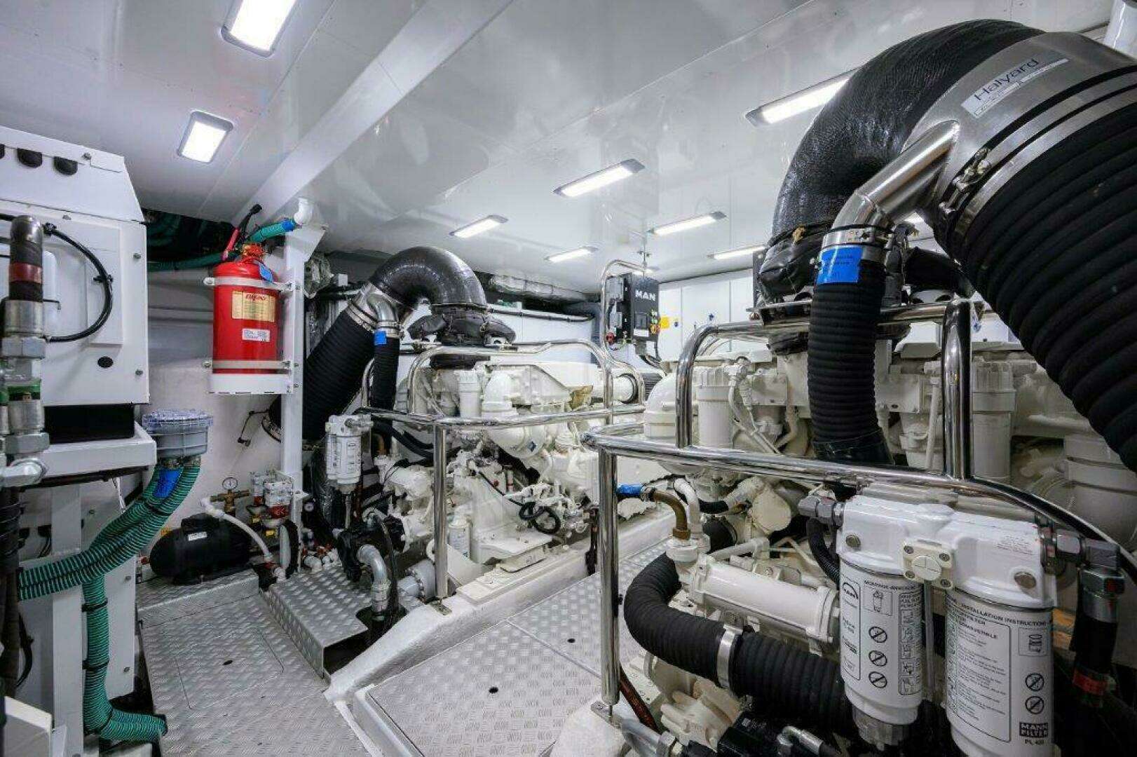 - Automatic/manual override fire extinguishers in engine room with warning system at helm position