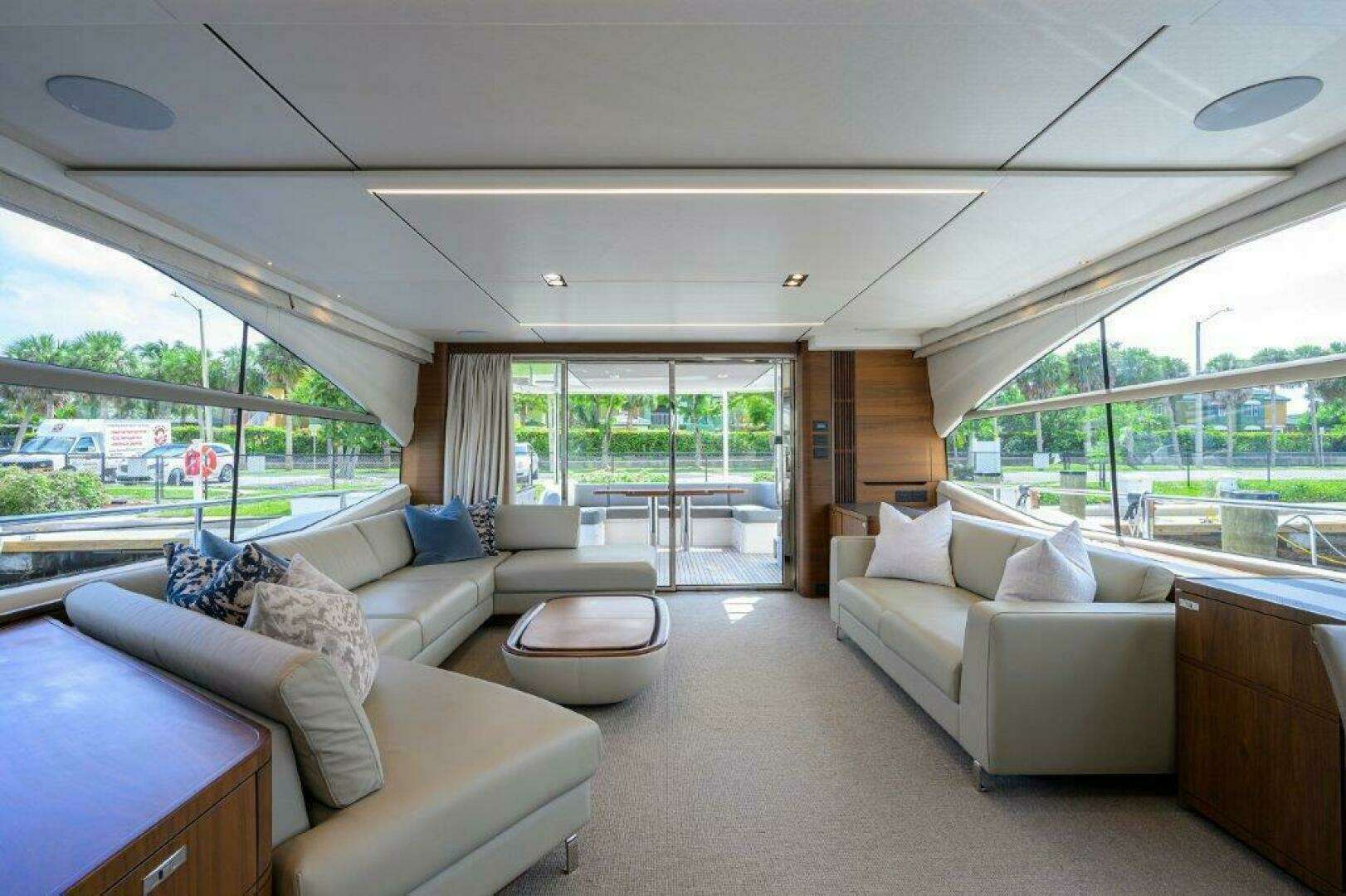 - Stainless steel framed sliding doors to aft cockpit with integrated opening window aft of galley U-shaped seating area with two-seater chaise and coffee table