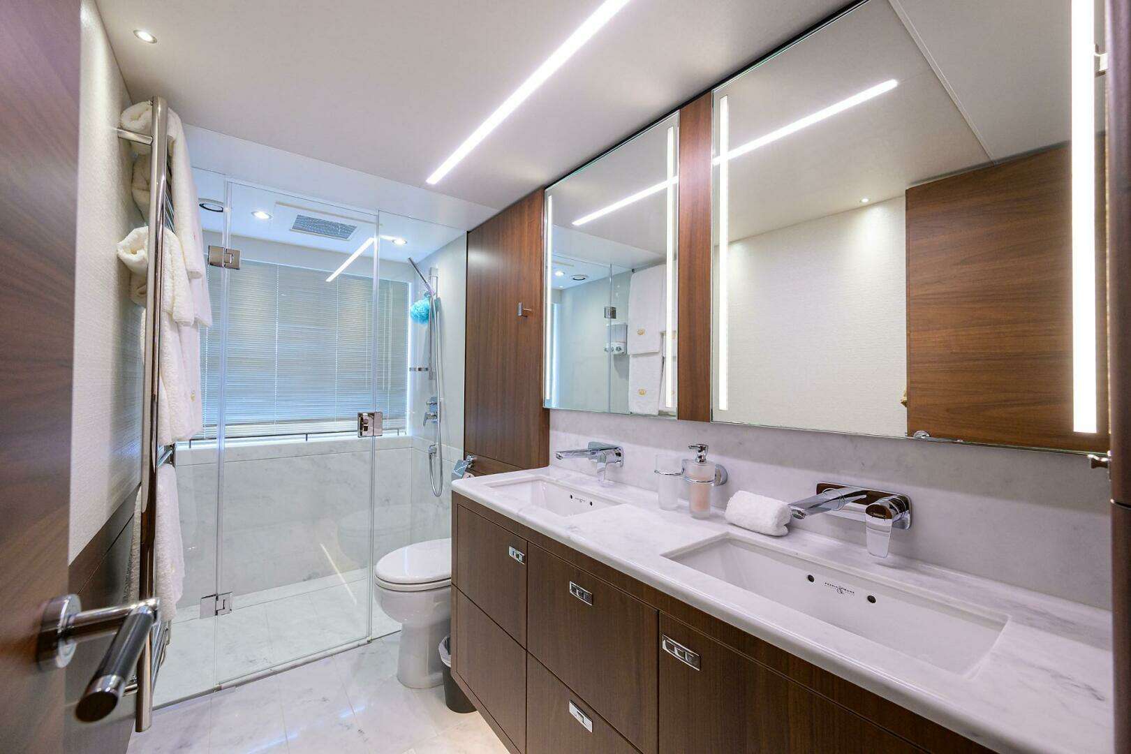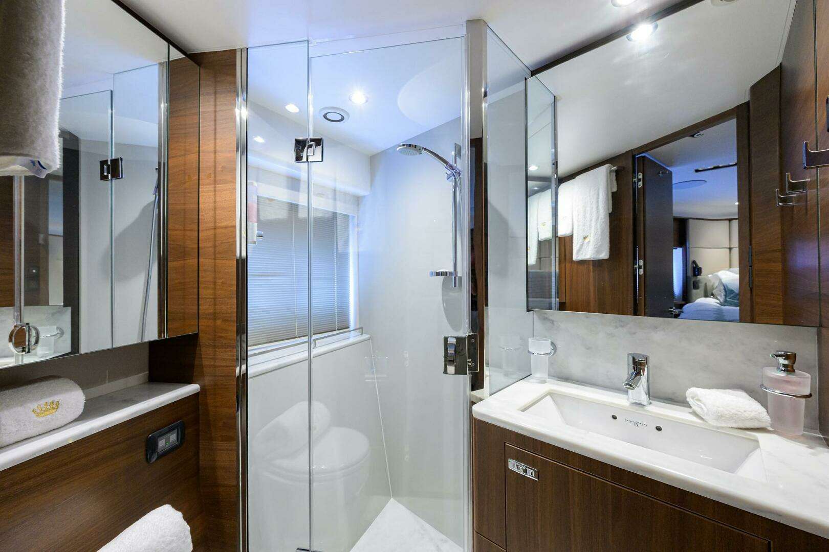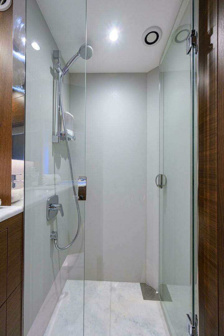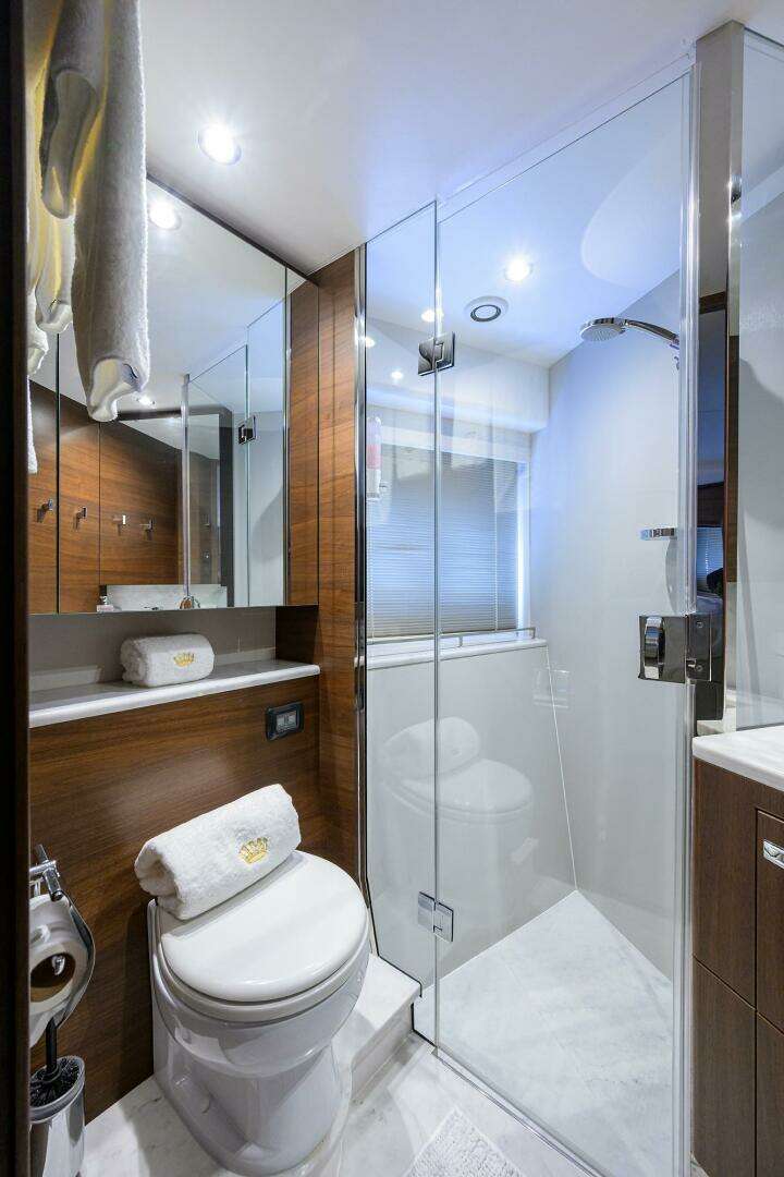 - Bathroom with separate stall shower, electric freshwater toilet and washbasin.