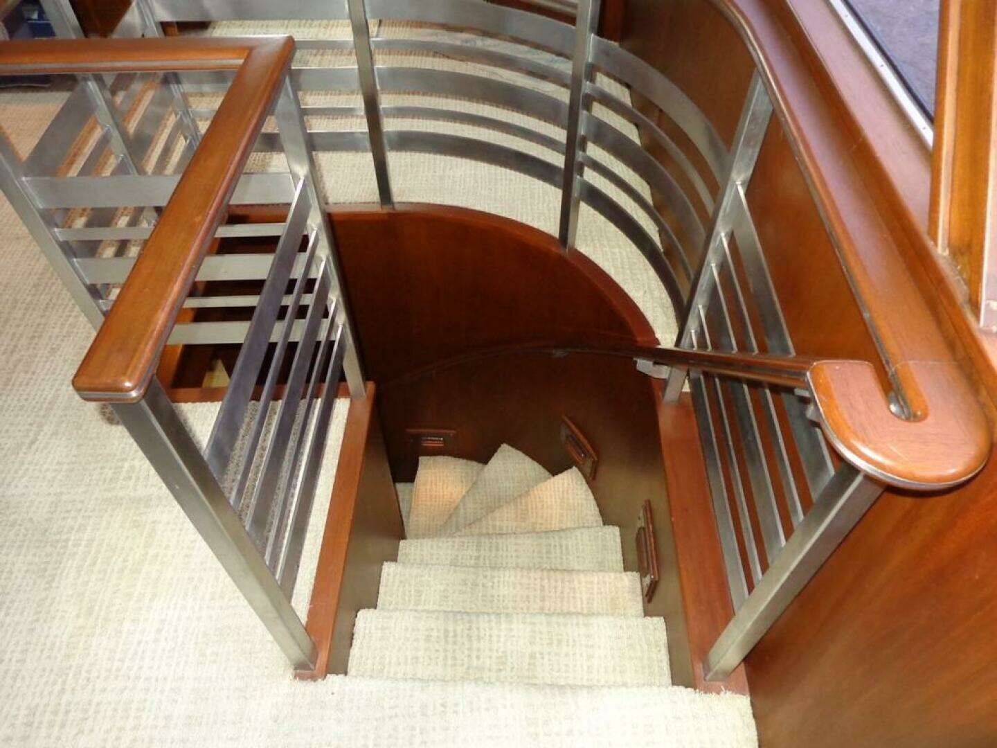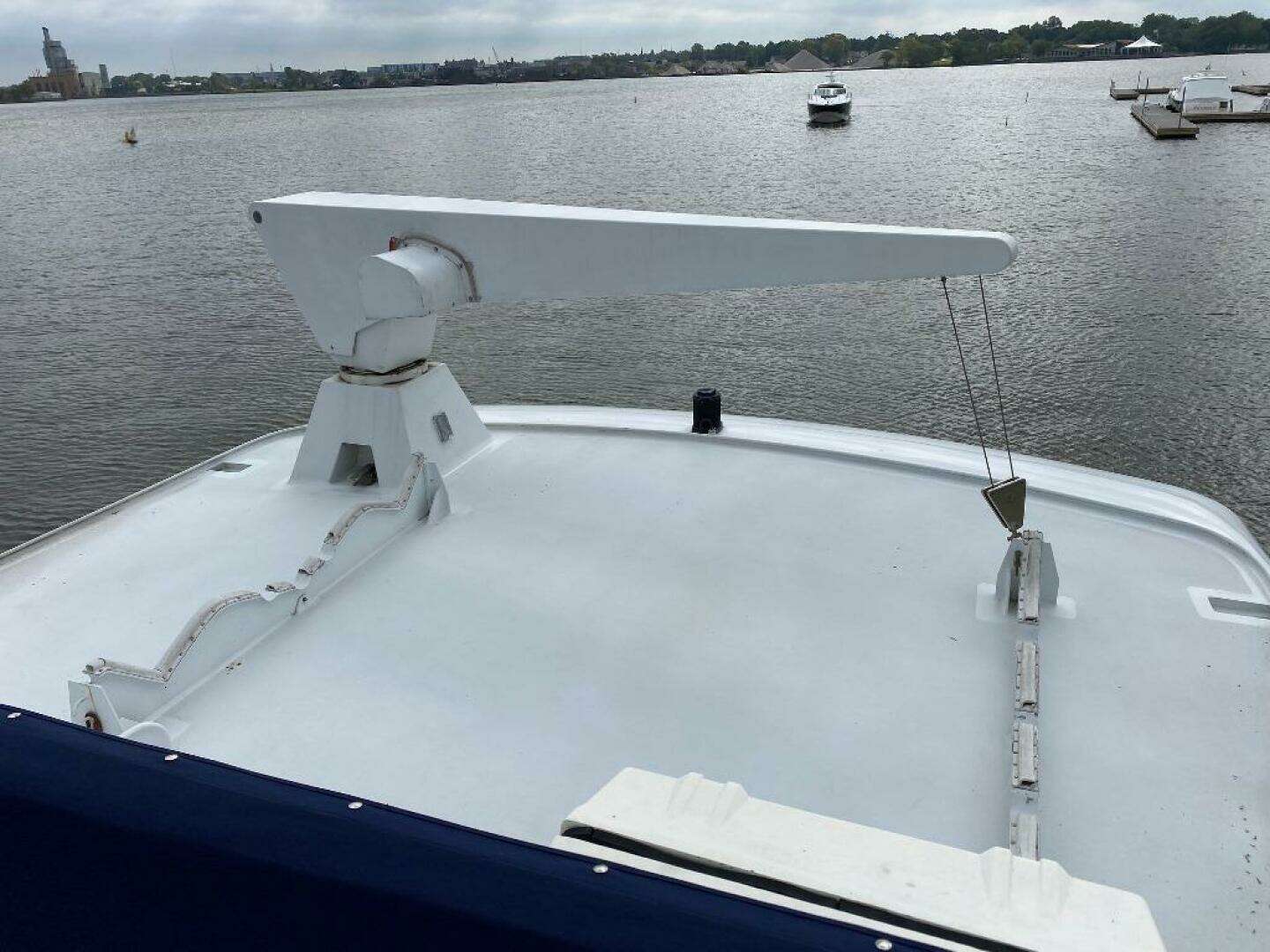Back up in the pilot house is the stairwell access to the enormous bridge deck. There is enough wrap-around seating on the bridge to accommodate all of your family and friends and maybe even all of their families and friends-It's that BIG!! There are two captain's chairs, a sink, a Jenn Air electric grill, and a crane davit for a tender on the aft section of the bridge. Note also a newer bimini top and newer upholstered seat cushions for the bridge and forward deck bench seating.