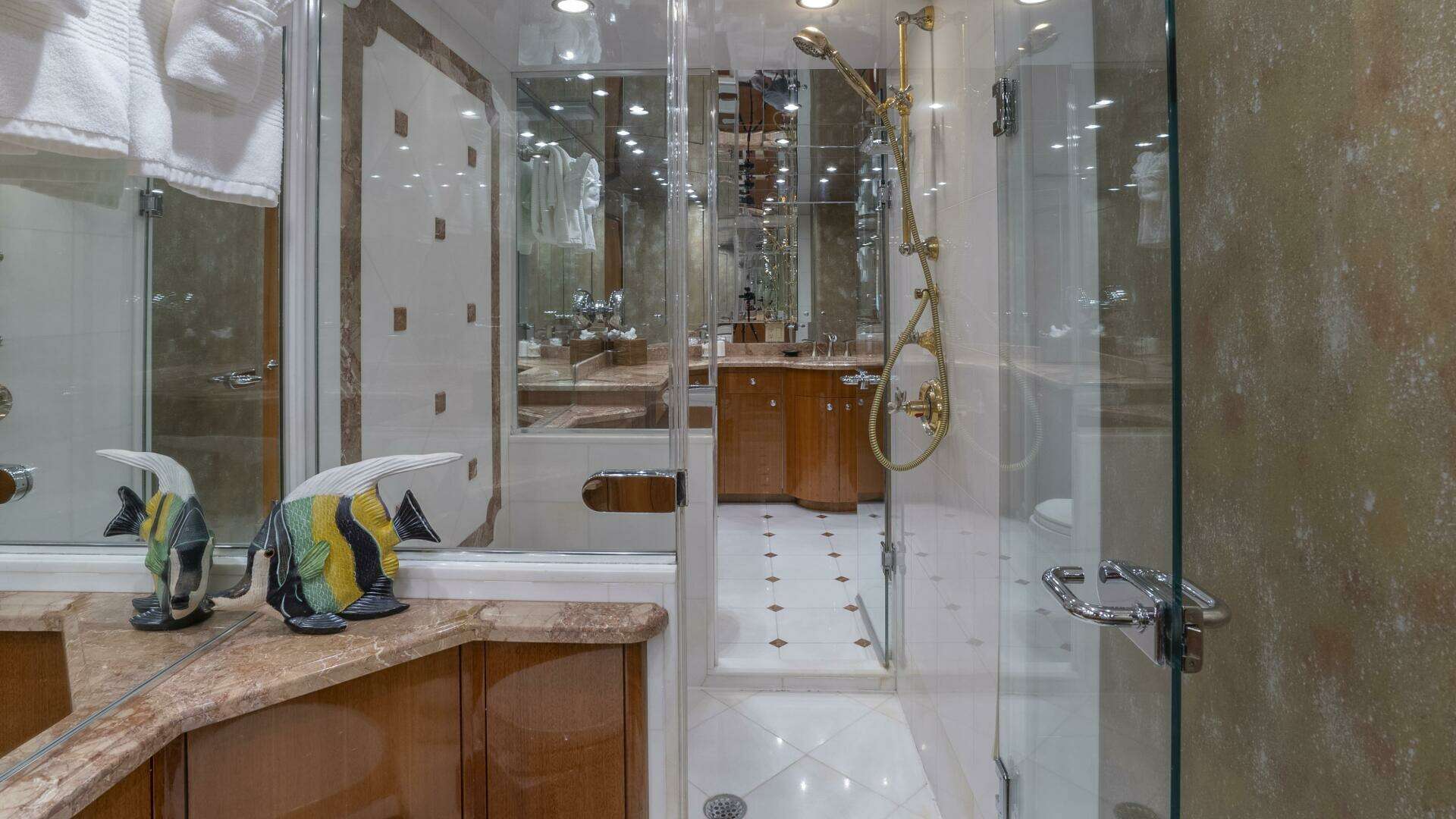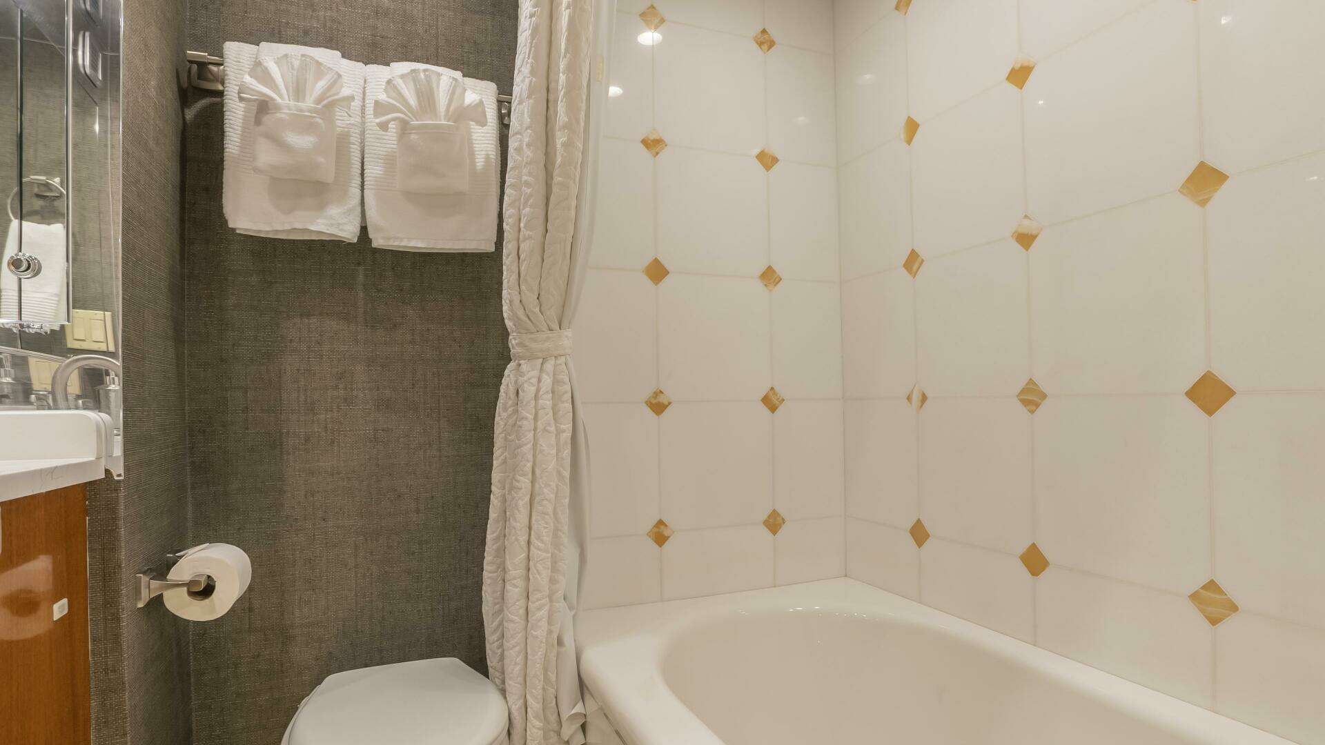 Below deck, Gallopin offers four beautifully appointed staterooms, each with ensuite accommodations. The full-beam master suite is a private haven, featuring a king berth, panoramic windows, a walk-in wardrobe, and a marble-clad ensuite bath. Every cabin reflects a dedication to comfort and tranquility befitting a true luxury yacht.
