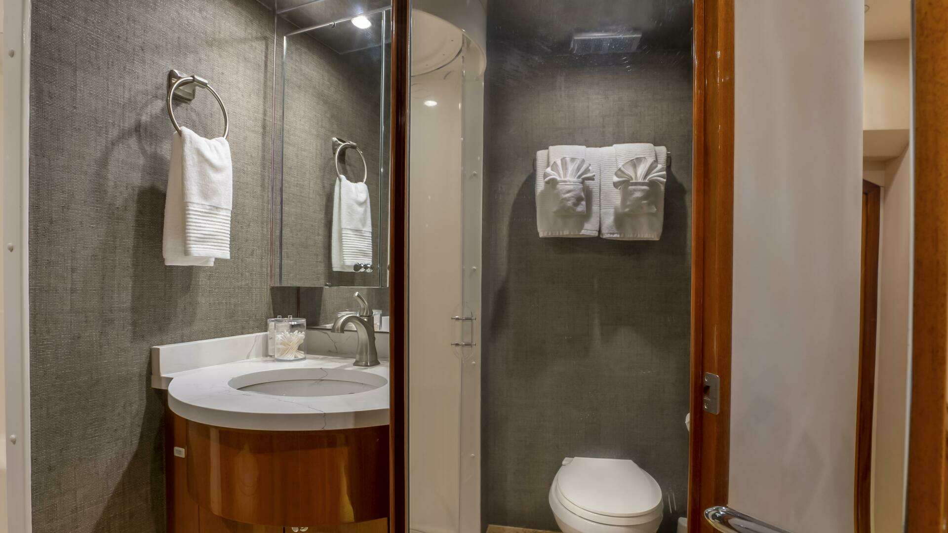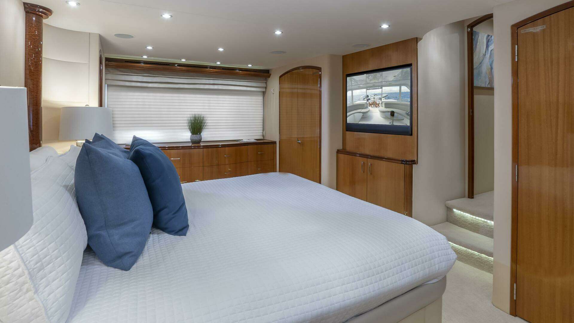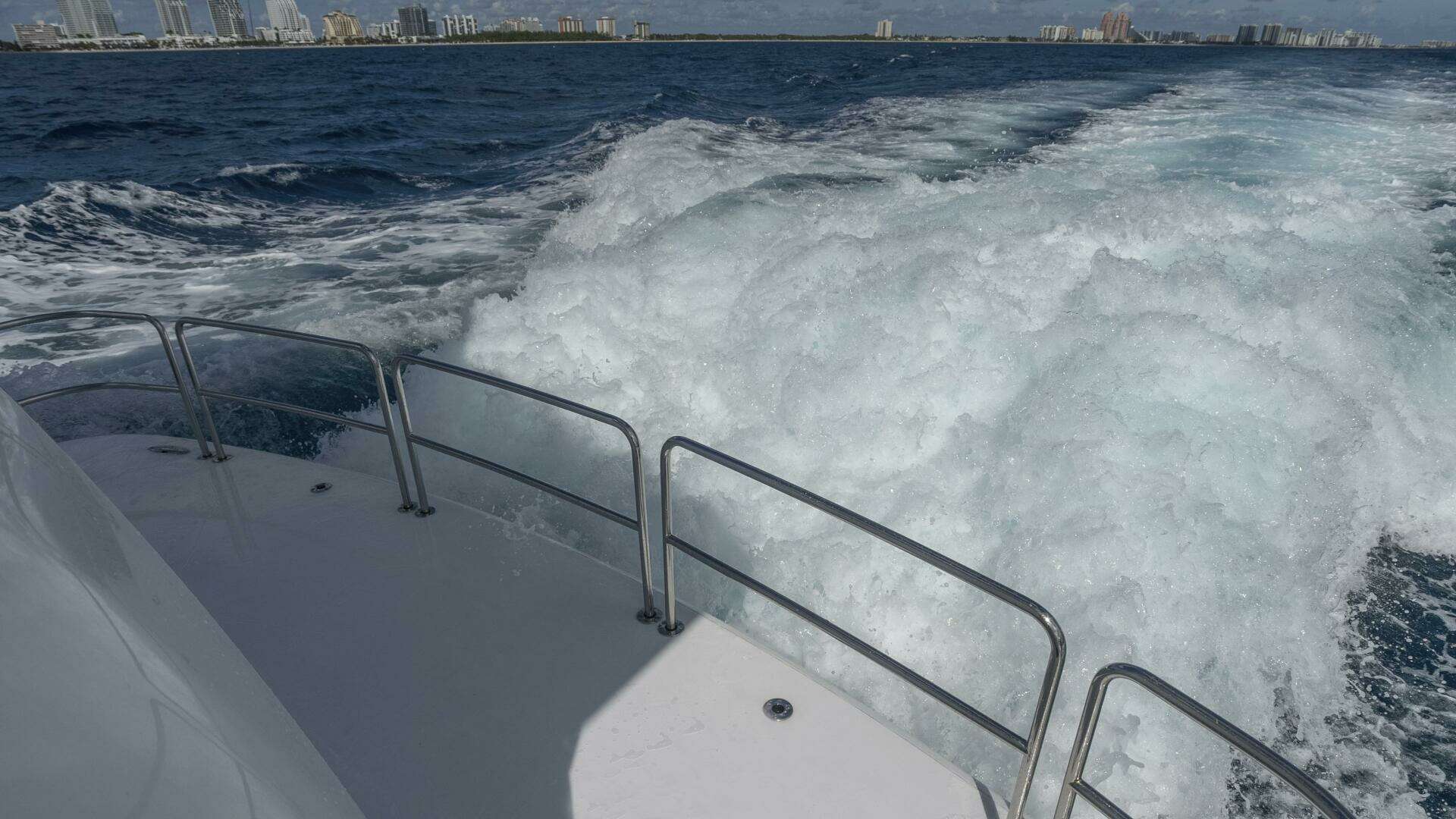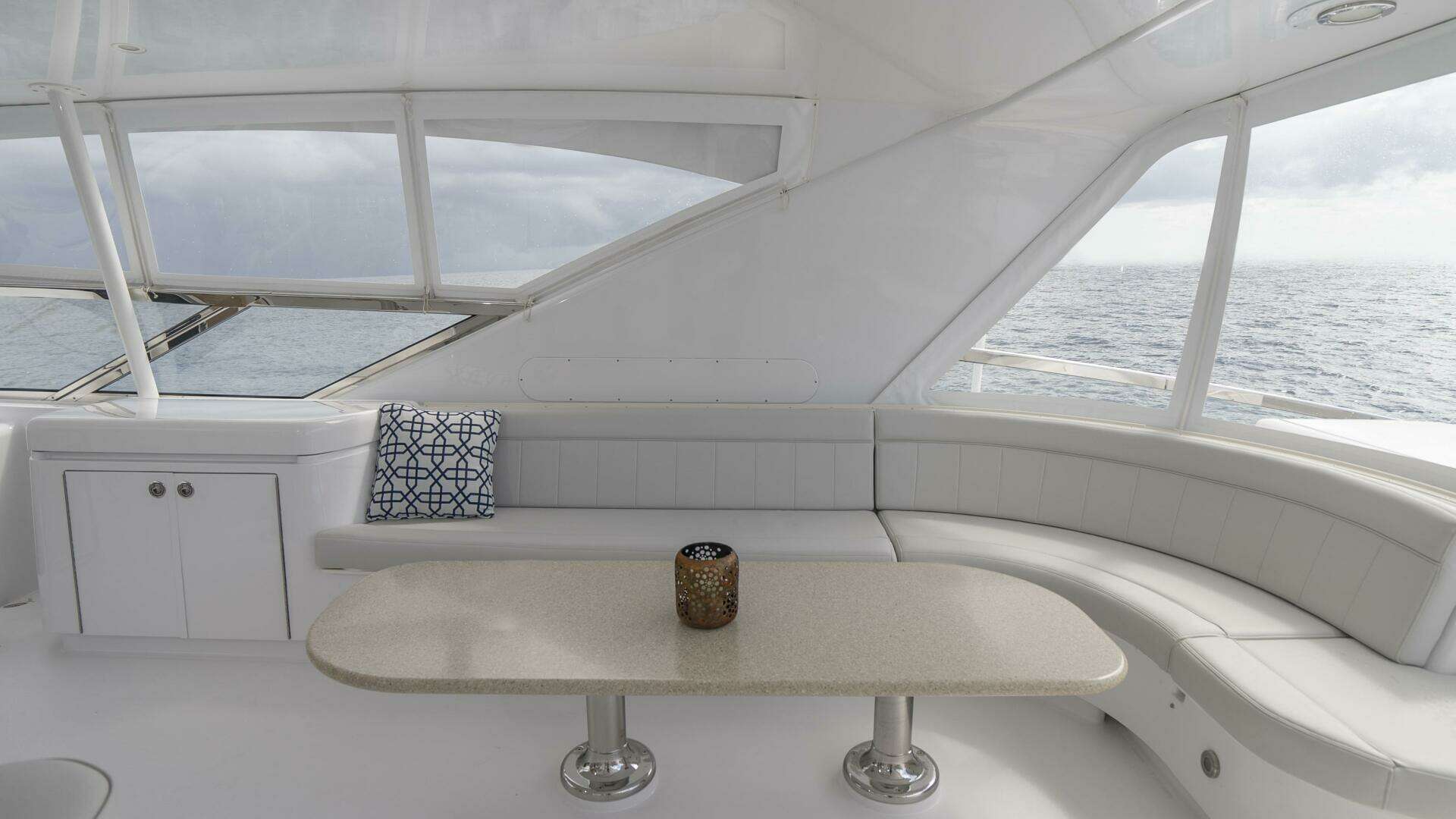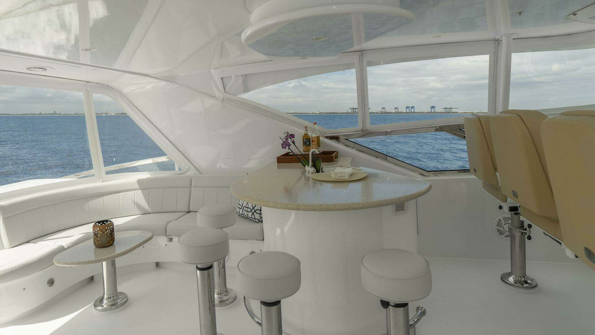 Her spacious flybridge offers panoramic views, a custom hardtop, wet bar, grill, and plush seating — the ideal setting for sunset cocktails or al fresco dining under the stars. Aft, a generous teak swim platform and lounge deck welcome effortless access to the sea, tender, or water toys.