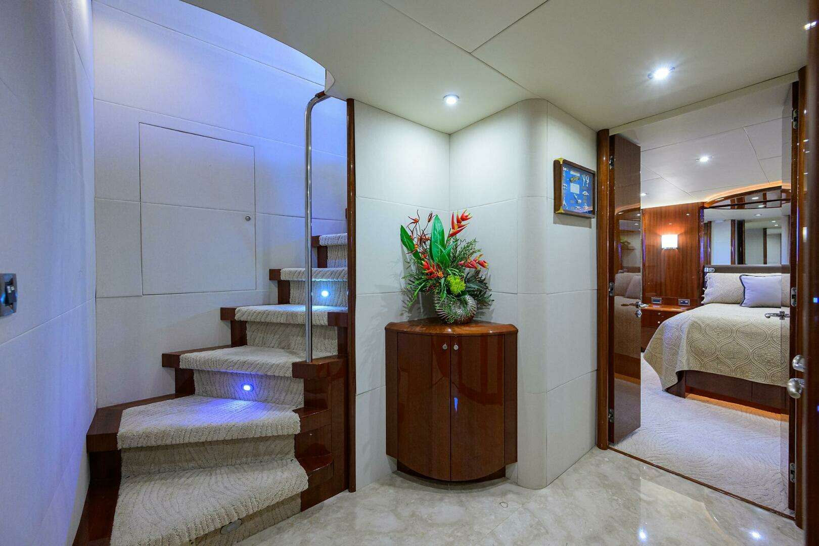 Upon entering WILLYN through the large stainless steel framed glass doors you are immediately greeted by the stunning dark high gloss wood throughout the main salon. Combined with the accent colors of taupe and grey the feeling of this yacht with remind you of home. The large custom cabinet on the starboard side is perfectly designed to store all your entertainment equipment including a pop-up TV, as well as offer ample amounts of storage for drinks and bar accessories.
