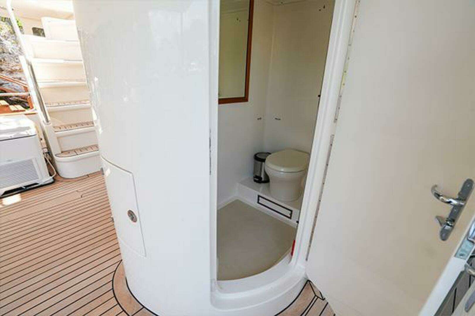 Boarding “FOMO” is easy and flexible: enter from the stern via twin stairways connected to the large hydraulic swim platform, or from either side through forward or aft boarding gates. The swim platform itself is expansive, ideal for water activities or relaxed lounging. A large, hydraulically assisted transom door provides access to the lazarette, crew quarters, and engine room.