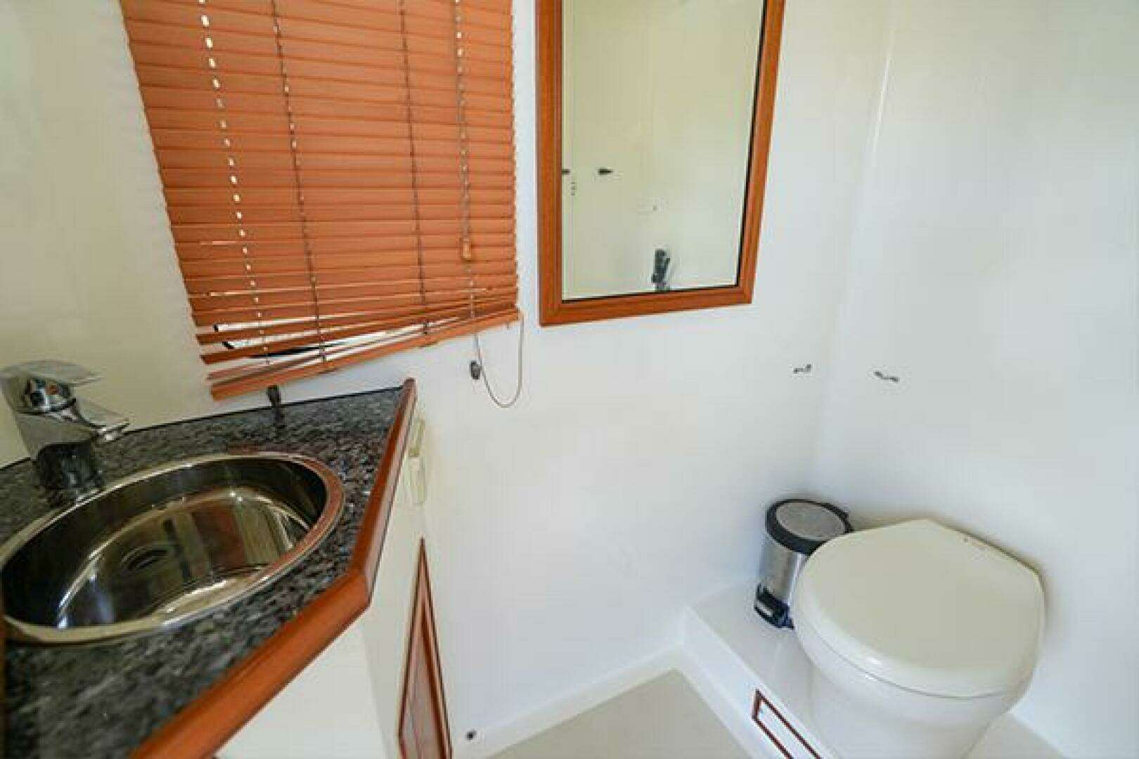 The starboard guest stateroom has twin side by side berths, with built in storage underneath, and a cedar lined hanging closet. Complete with an en-suite head, full shower, granite counter tops, electric push-button toilet, and Grohe fixtures.