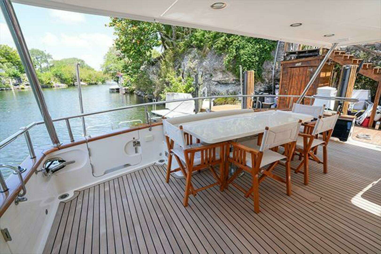 Walking up three steps brings you to the spacious, modified U-shaped galley, featuring numerous upgrades including granite countertops, a stainless-steel Franke sink with a cutting board cover, Grohe faucets, and a garbage disposal. The galley is equipped with a full suite of appliances: a stovetop, electric range with oven, microwave, and two Sub-Zero refrigerator/freezer drawers (one located just forward of the galley). Ample cabinetry and drawer space ensure that everything you need is within reach. This open, well-appointed galley is perfect for entertaining, and gourmet chefs will thrive in its functional and elegant design. Located forward of the galley, the dining area is designed to seat twelve comfortably around a large U-shaped dinette. Surrounding the dining space are expansive windows constructed from laminated double-layer tempered glass, offering superior hurricane and weather resistance while enhancing physical security and maintaining watertight integrity. The 360-degree views from this elevated position are simply stunning. A built-in deep freezer and a pop-up TV to port add further convenience and entertainment options, ensuring guests are reluctant to leave.