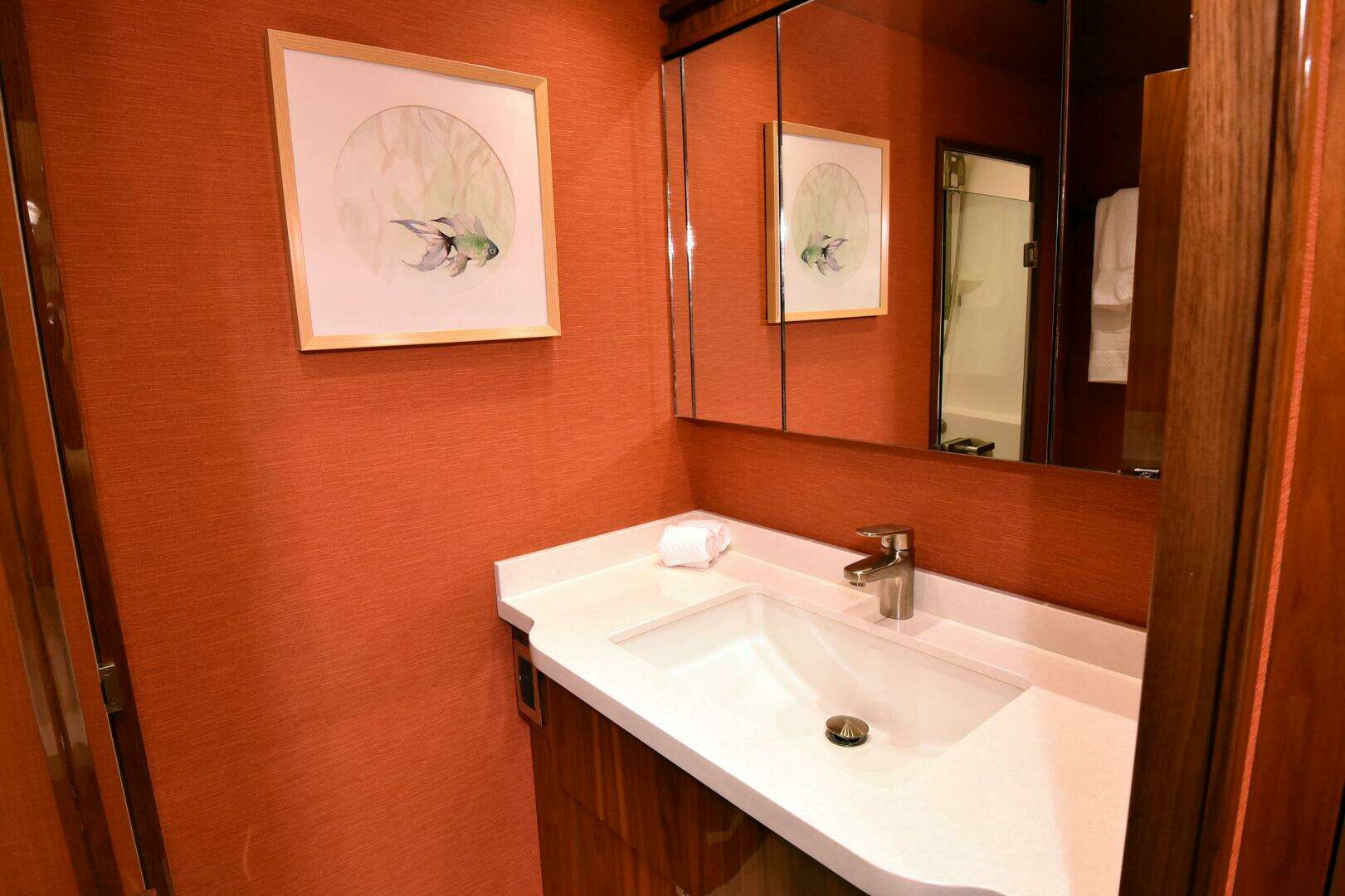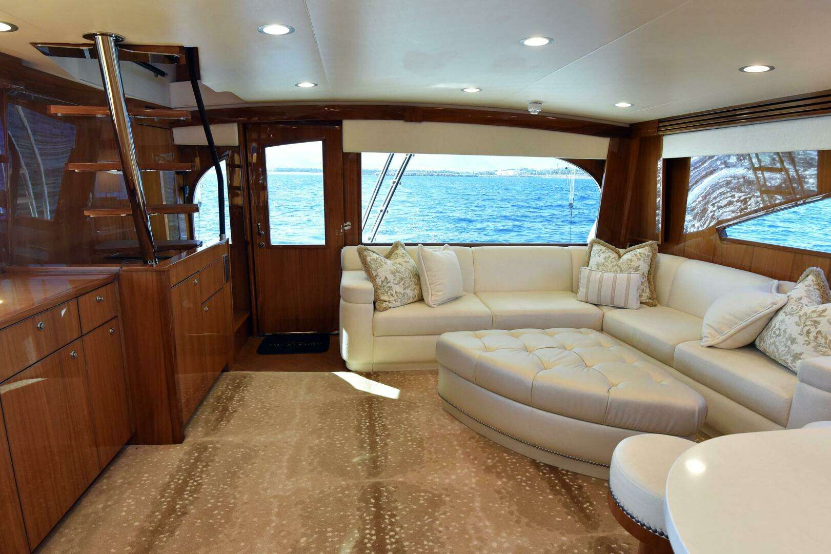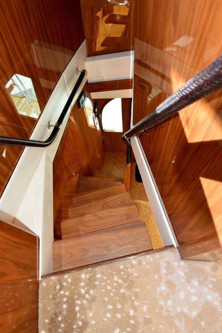 Step inside to a salon of satin walnut joinery and premium leather appointments, where a 21’5” beam creates an open, great-room feel. Five beautifully appointed staterooms include a full-beam master with king berth and private head, while each guest stateroom offers comfort and privacy. The flybridge is a command center for both fishing and entertaining, with a center-console helm, excellent visibility, ample seating, rod storage, and an optional climate-controlled enclosure.