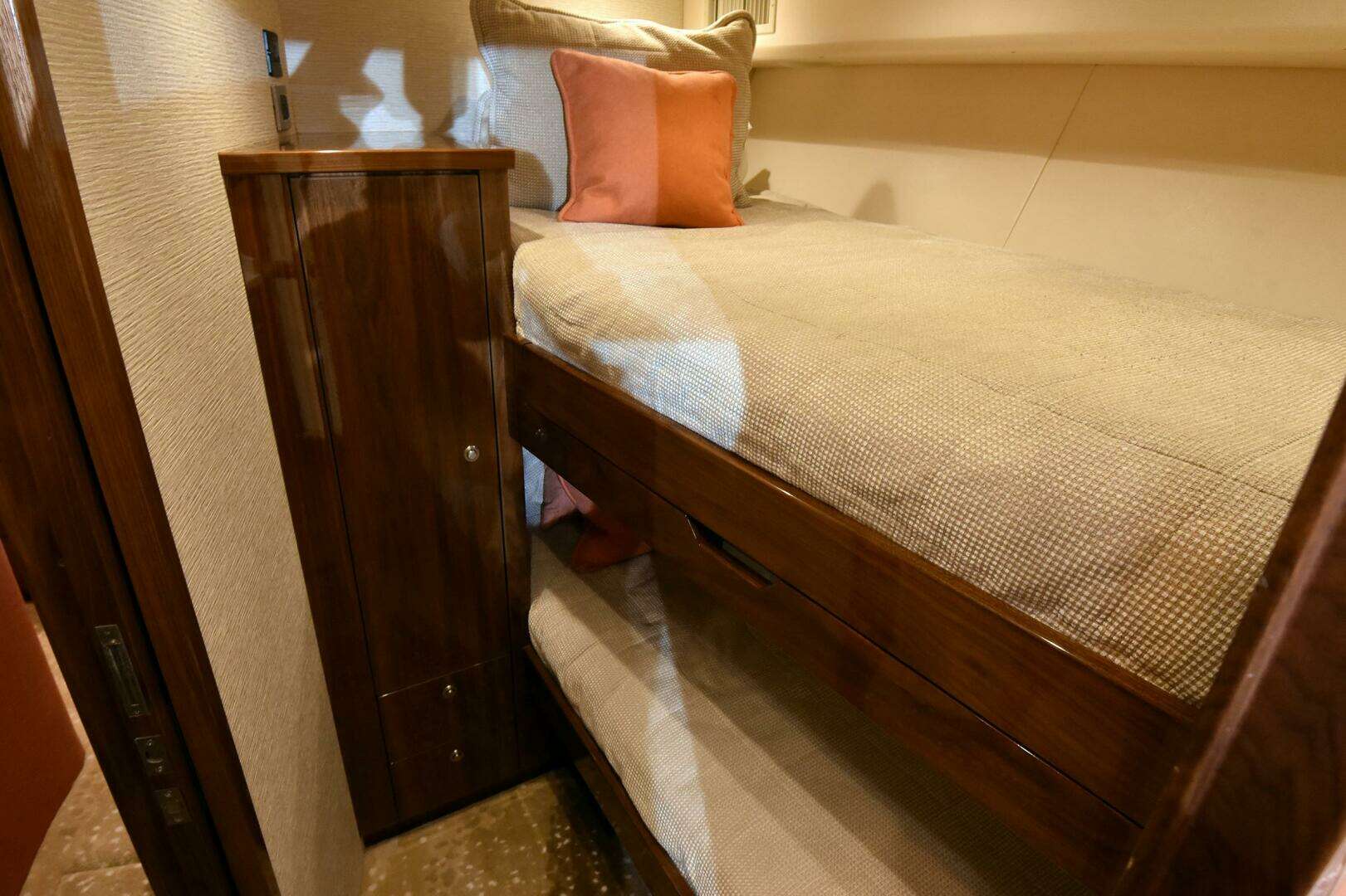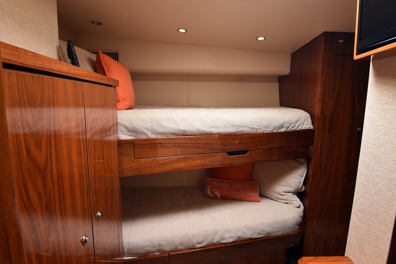 2019 Viking 80 Skybridge "PARTY OF FIVE" features a five stateroom 5 head layout below with split berths in the port guest stateroom, queen berth forward, two staterooms with upper and lower berths with concealed rod storage in each of the upper berths, and a full beam master stateroom with electric blinds and custom opening portlights. The salon/galley/dinette/day head layout on the main deck provides a sumptuous living area for all. The galley is accessible from the salon and forward, opposite the dinette. Features include an oven, custom lighting and storage, electric blinds, an additional TV above the dinette, and easy stair access to the enclosed flybridge.
