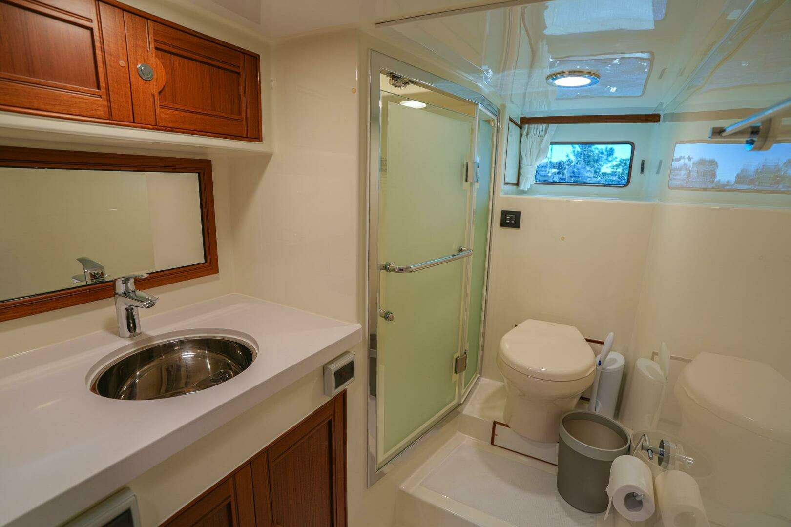 The spacious VIP stateroom showcases a generous king centerline berth, flanked by beautifully crafted cedar-lined teak storage lockers for a refined and organized feel. Guests enjoy the luxury of a private en-suite head with a generously sized shower. Two bidirectional opening overhead skylights fill the space with natural light, creating a bright and inviting atmosphere. Overhead bunks provide additional accommodations and conveniently double as storage shelves when not in use. Upgraded teak planking along the hull sides enhances the room’s classic elegance, combining timeless style with practical functionality.