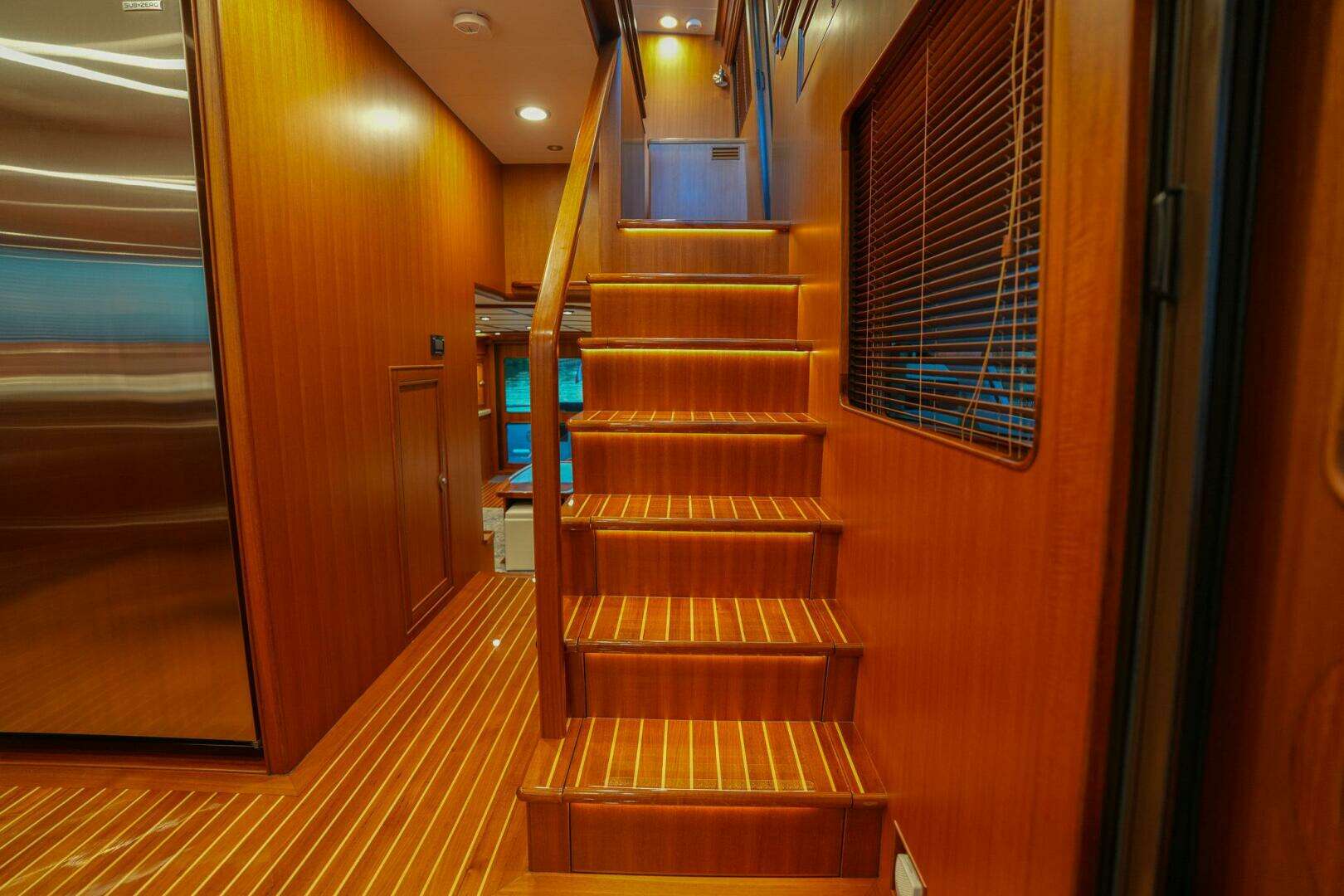 - Crew quarter and engine room access through large hydraulic “garage door” at the transom and through watertight staircase at the forward port side of the cockpit, under the stairs to the Command Bridge