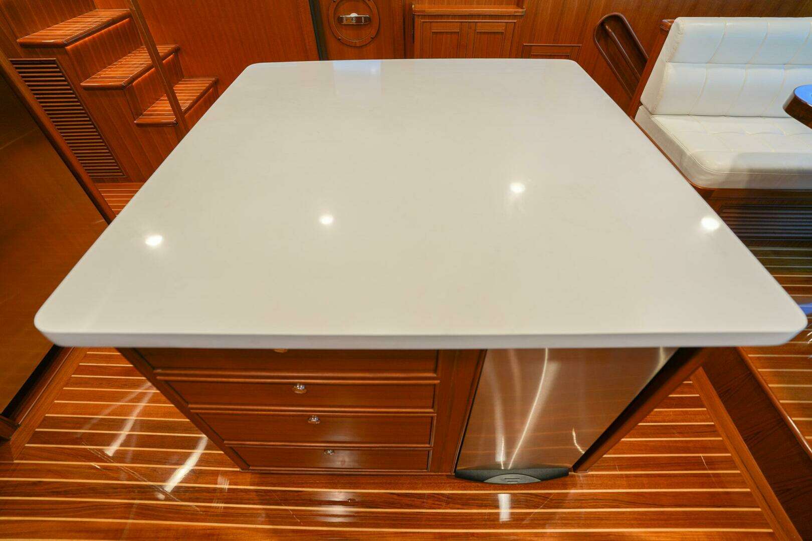The fully enclosed, climate-controlled command bridge is designed for comfort and functionality. It features a convenient day head with a shower, captain's quarters and a spacious L-shaped seating area centered around a versatile teak high gloss high/low table. Pop-out control stations on both outboard corners provide exceptional visibility and flexibility while maneuvering in addition to the wireless Dockmate remote control with DPS.