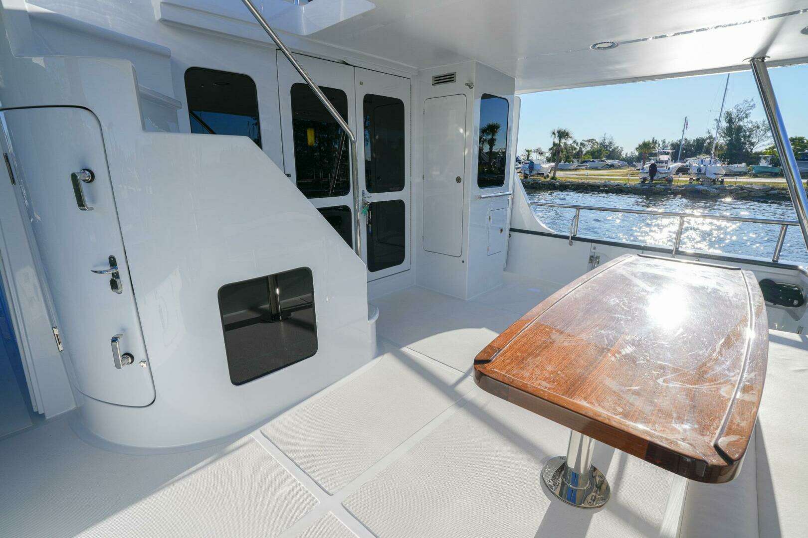 The aft deck is designed for both elegance and comfort, featuring a striking high-gloss teak table as the centerpiece for al fresco dining. A spacious forward-facing settee can comfortably seat 6-8 guests with chairs on the forward side, creating an inviting space to relax, entertain, and take in the breathtaking surrounding views.