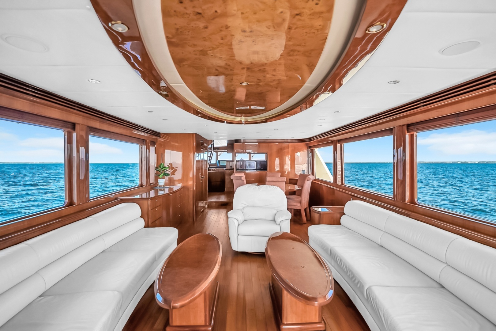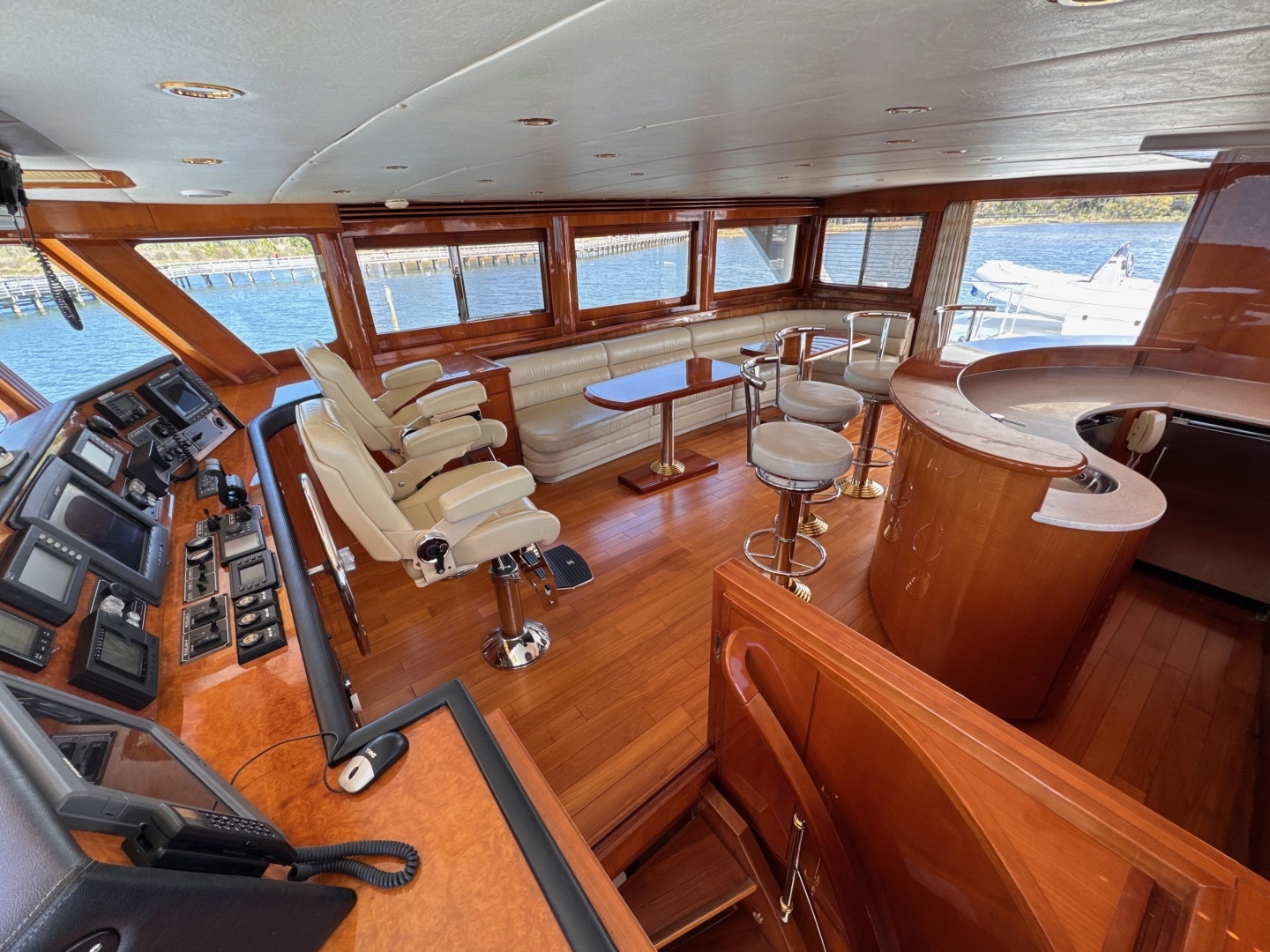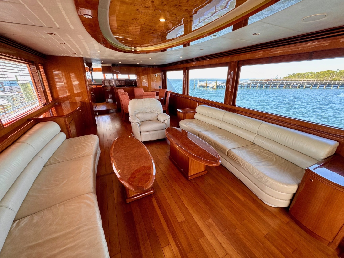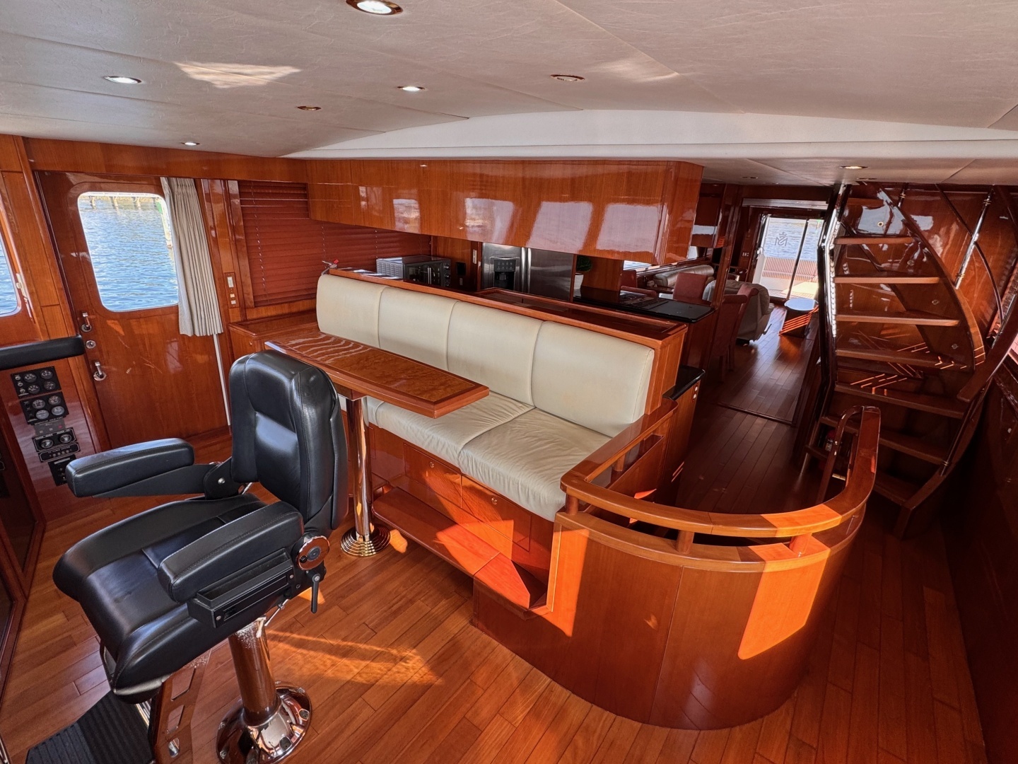 Ample seating arrangements create a comfortable environment for hosting guests or enjoying time aboard. Rich wood joinery and cabinetry throughout the interior reflect the craftsmanship associated with yachts of this class.