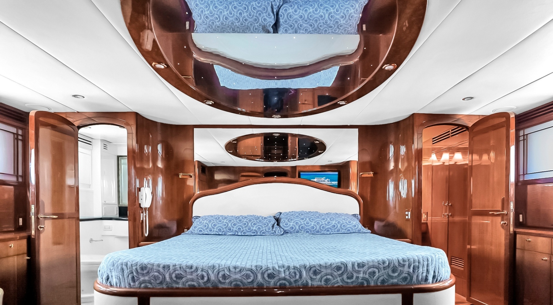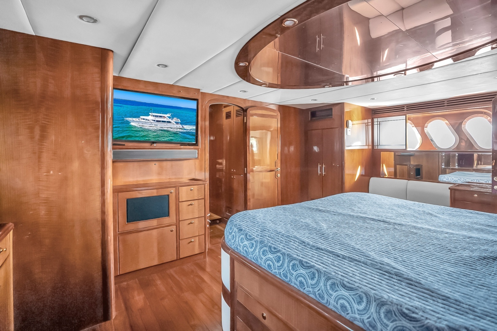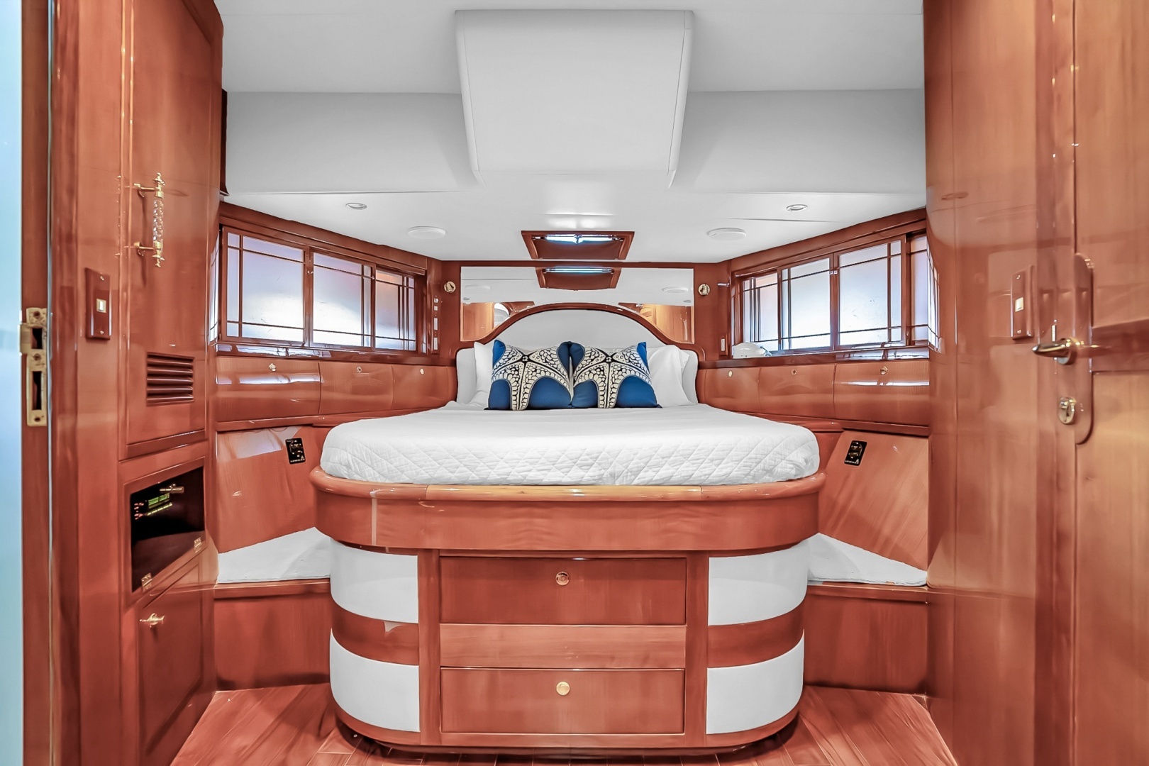 Aft of the guest cabins, the full-beam master stateroom offers a spacious and well-appointed retreat. A centerline king berth is surrounded by ample storage, including drawers, cabinetry, and full-height cedar-lined closets.