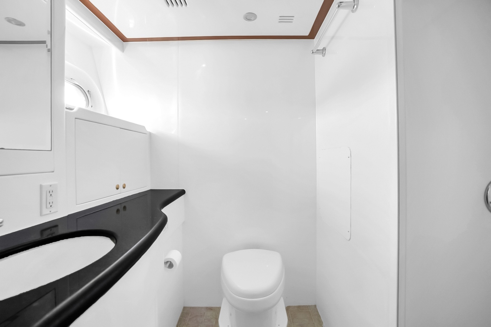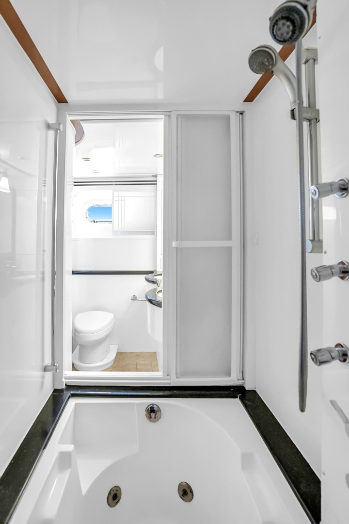 Positioned forward in the bow and elevated slightly for added separation, the VIP stateroom features a queen berth beneath an overhead skylight. The ensuite head is located to starboard, while a separate shower to port includes a bench seat and multiple body spray fixtures. Additional features include a cedar-lined closet and flat-screen TV.