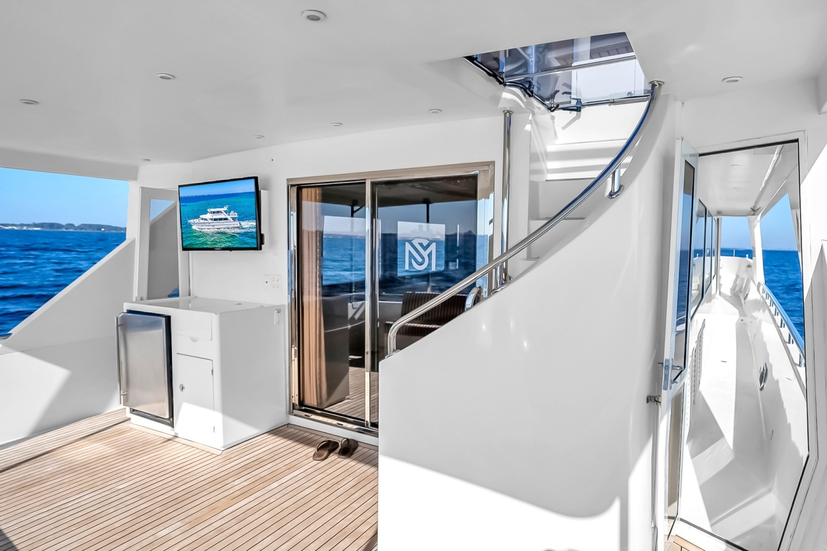 The aft deck is accessed from the main salon, side decks, boat deck, or crew quarters via the transom door. This area is well-appointed with a large settee, teak decking, outdoor television, refrigerator, and sink, making it a natural gathering space while at anchor or dockside.