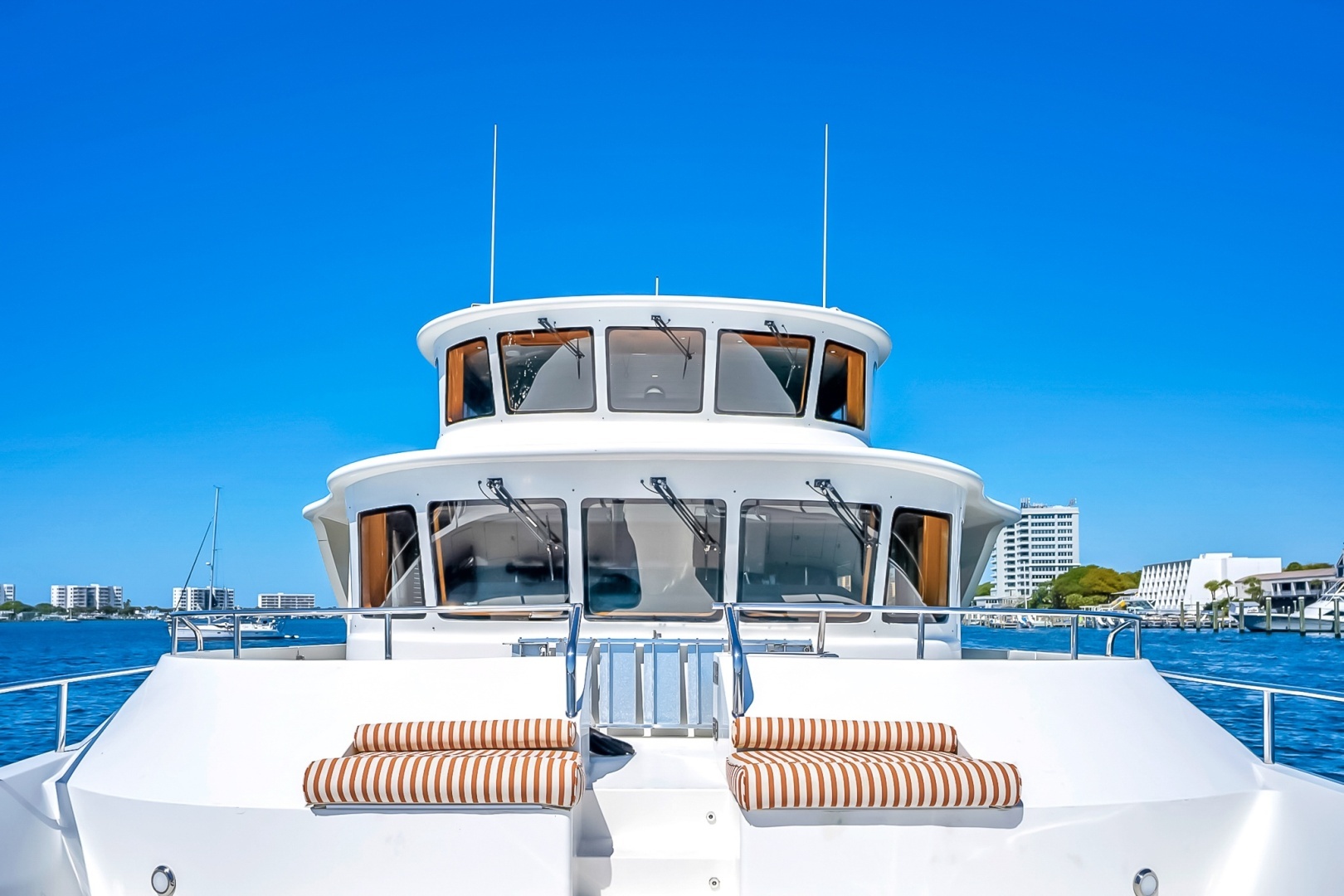 Above, the enclosed skylounge serves as an additional salon, offering comfortable seating, excellent visibility, a dedicated bar area, and a second helm station. The boat deck aft includes wing stations that provide excellent control when docking or maneuvering.