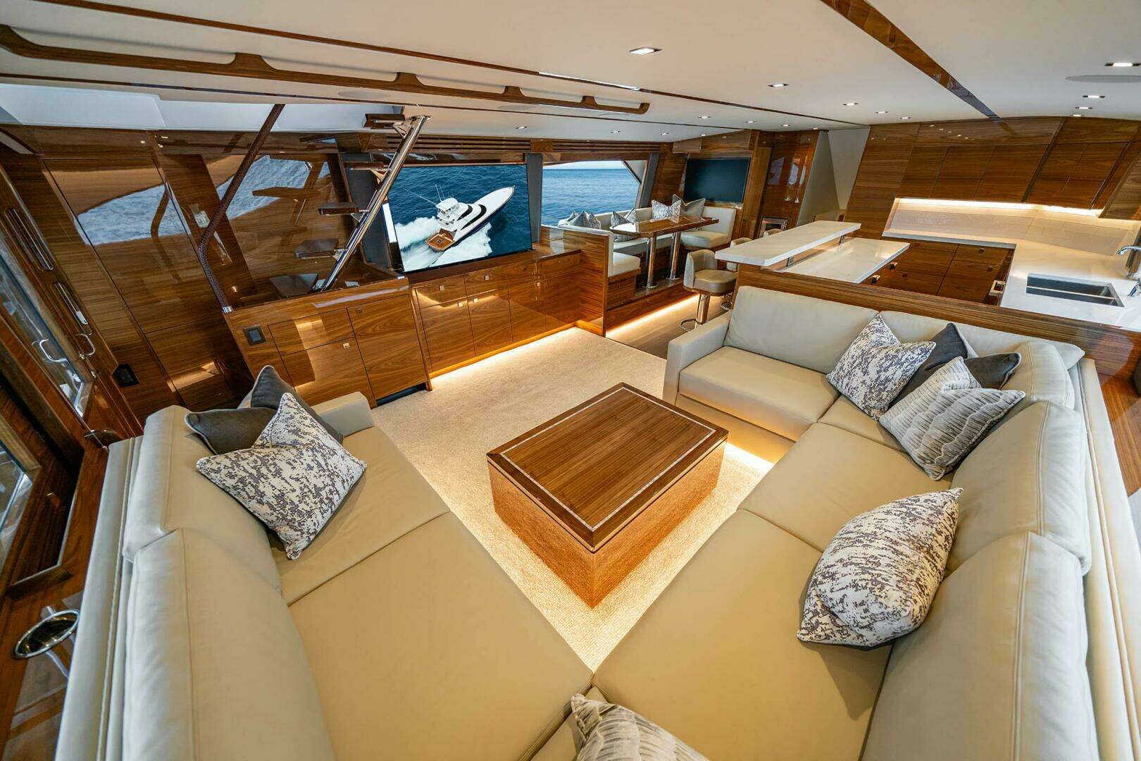 The salon welcomes guests with panoramic windows, a large sofa with storage, formal dinette, and open galley featuring under-counter refrigeration, an electric cooktop, convection oven, and bar seating. Premium finishes and horizontal-grain walnut joinery throughout create an elegant yet durable interior.
