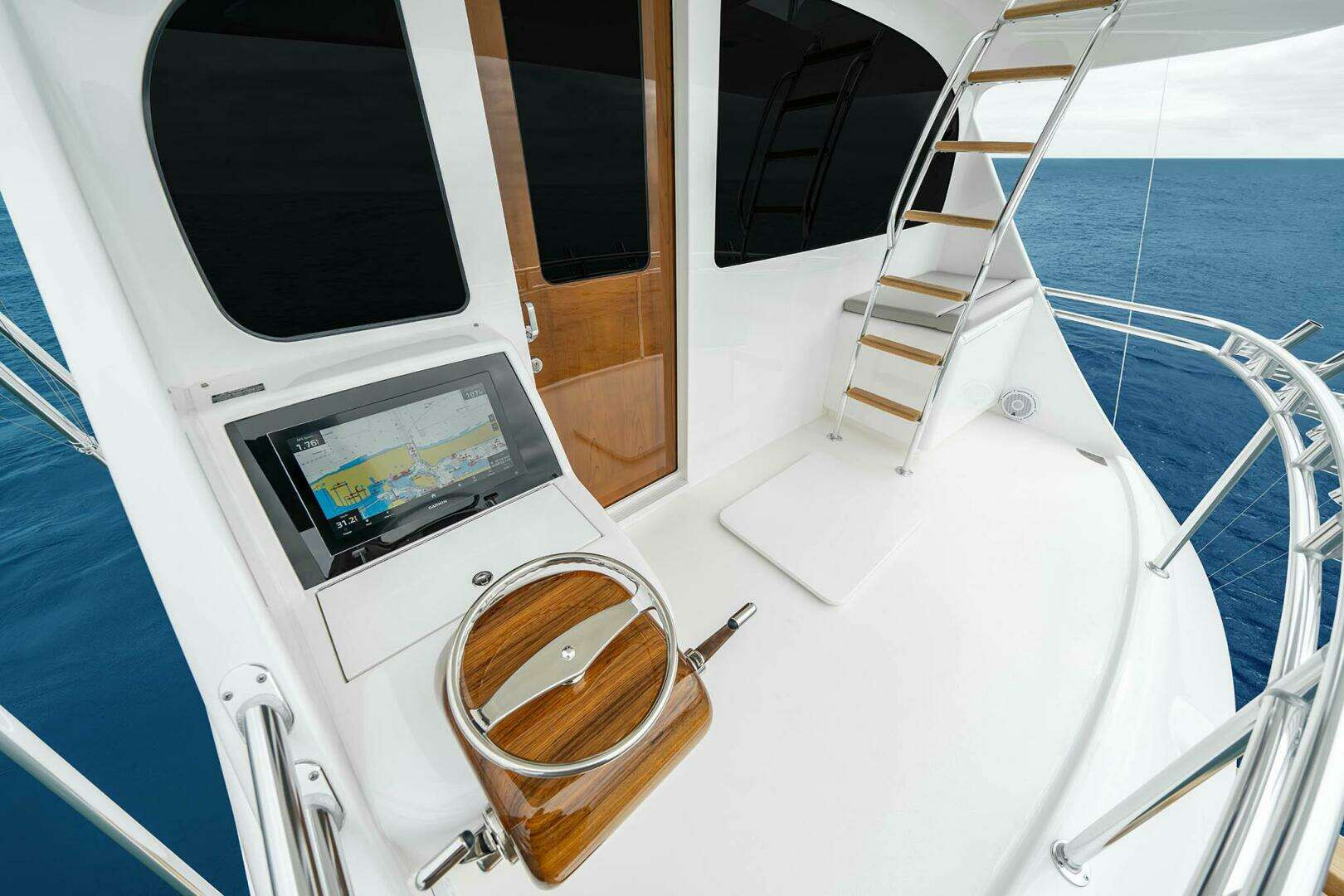 The Sky Bridge configuration provides the functionality of two complete helm stations: a fully enclosed bridge and an open-air upper helm. The enclosed bridge features a centerline helm with twin companion chairs, a large L-shaped lounge, HDTV, refrigerator, and a one-piece windshield. The sky bridge above offers a second helm station with superb visibility, forward seating, and refrigerated drink storage for comfort during warm-weather runs.
