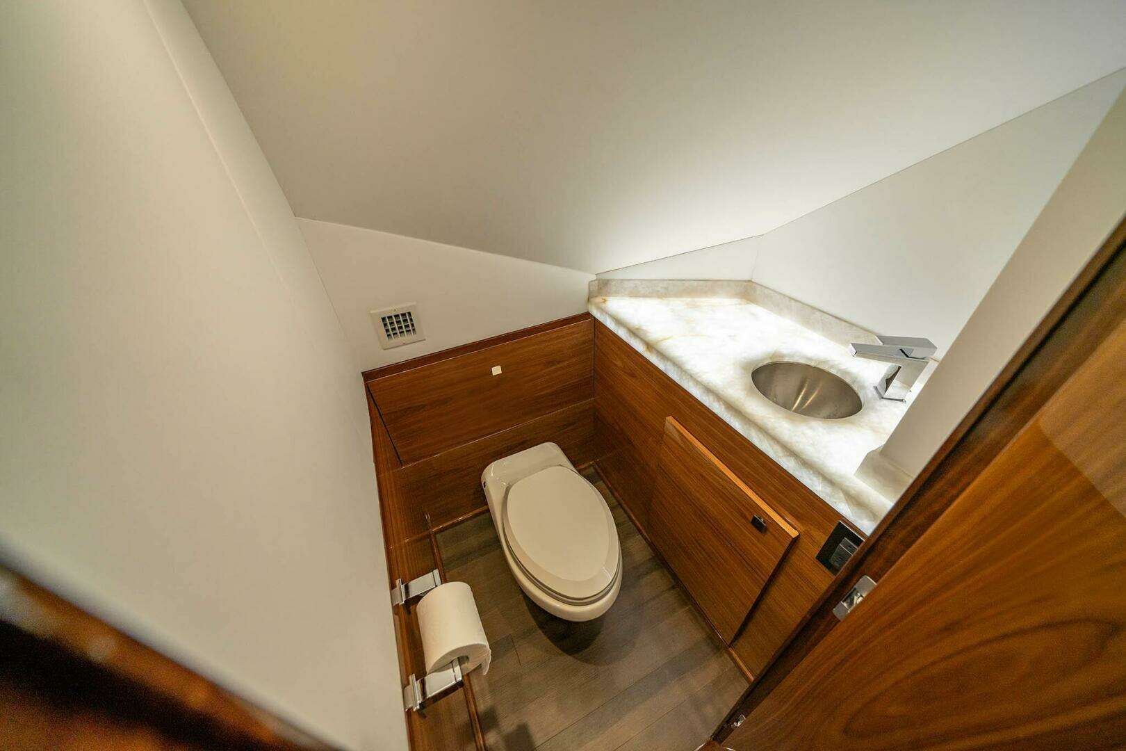 Below deck, the five-stateroom, six-head layout reflects Viking’s reputation for luxury and practicality. The full-beam master suite includes a king berth, lounge area, and en suite with dual sinks and a walk-in shower. The forward VIP features a queen berth and private head, while additional guest cabins provide upper-lower berths, en suites, and storage. Crew accommodations aft include direct engine room access.