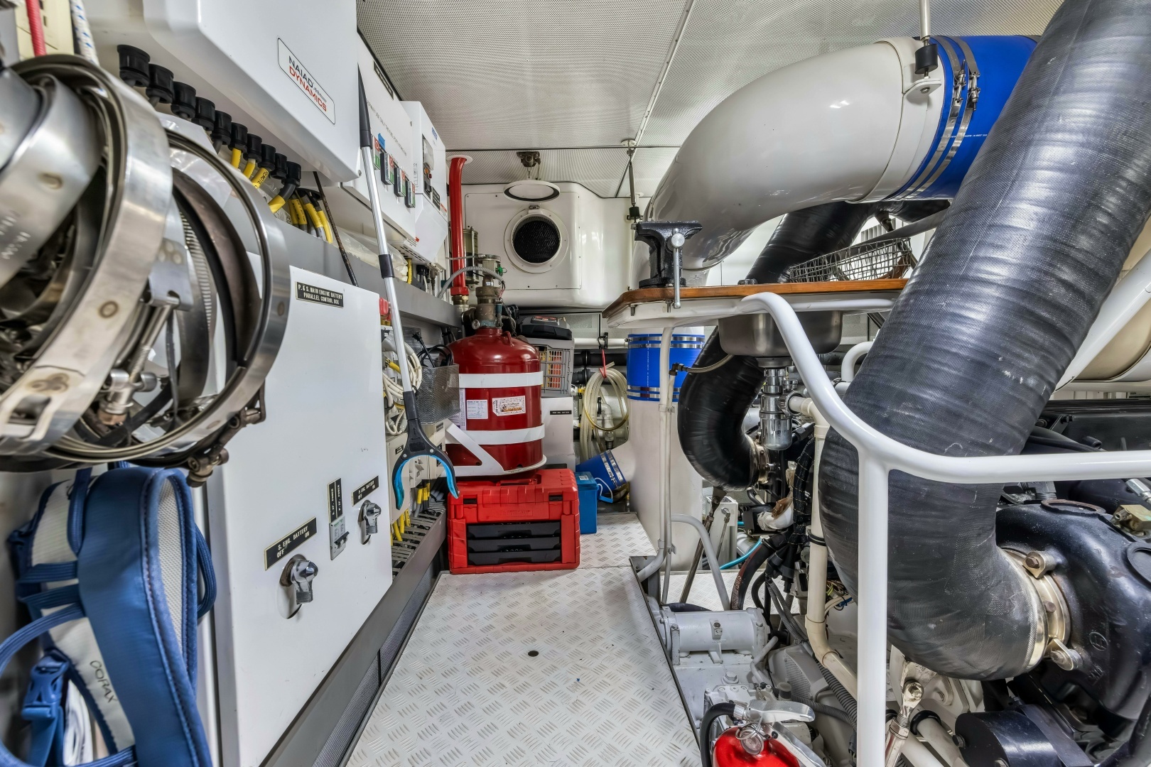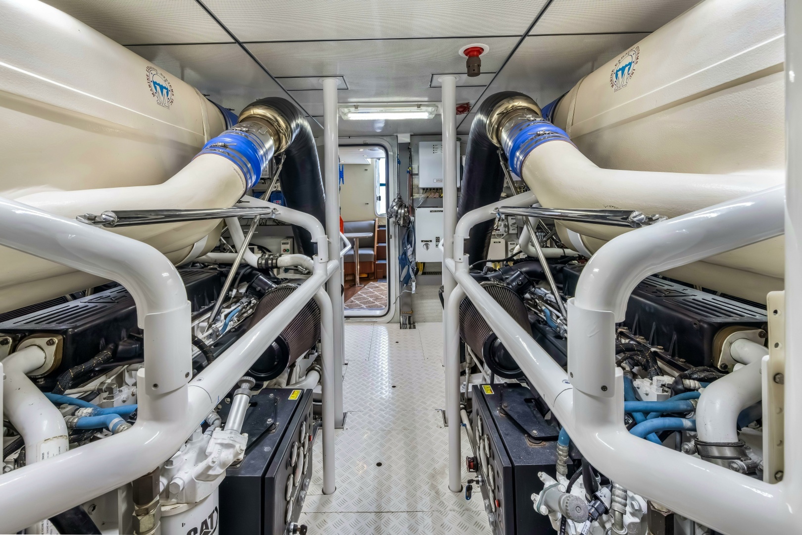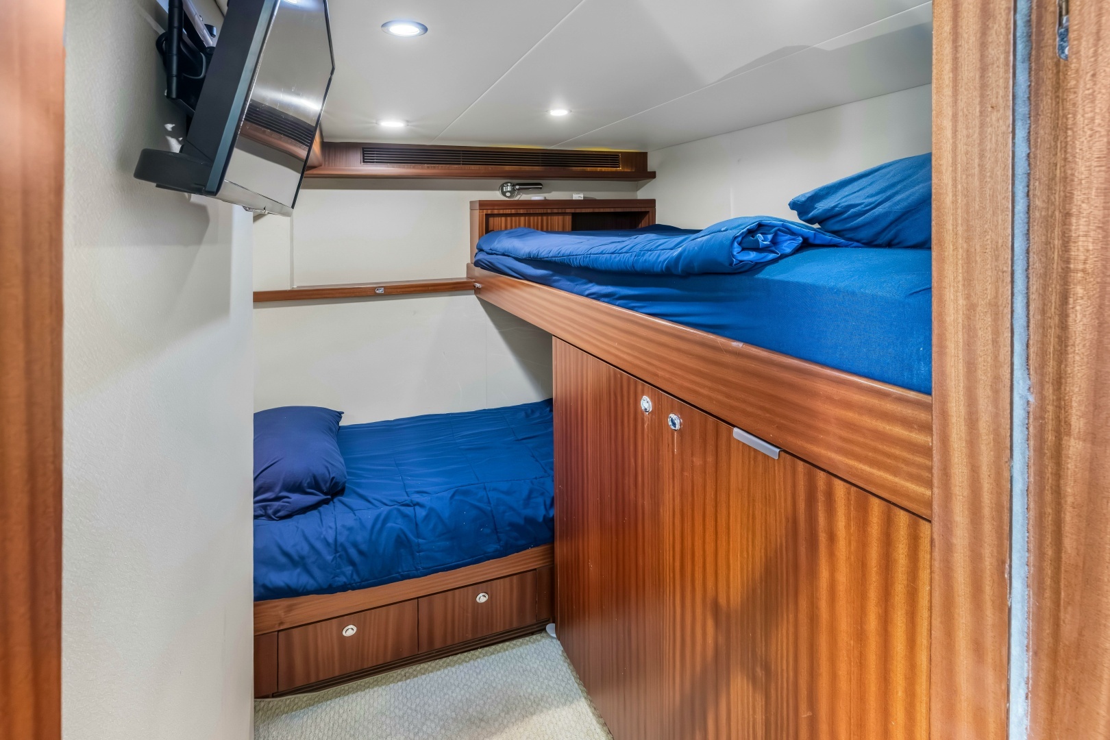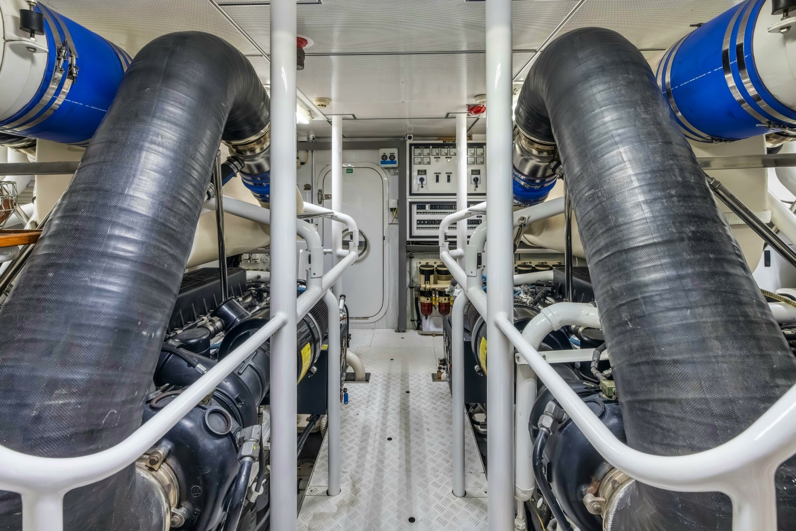 The crew quarters and engine room are accessed through a centerline transom door in the cockpit. Upon entry, you first arrive in the crew area, which includes a stateroom to port with two berths and another to starboard with a full berth. Moving further forward is the engine room, maintained to A-1 yacht-quality standards and equipped with twin Caterpillar C-32 ACERT engines, twin 32kW Kohler generators, and numerous additional “big yacht” features.