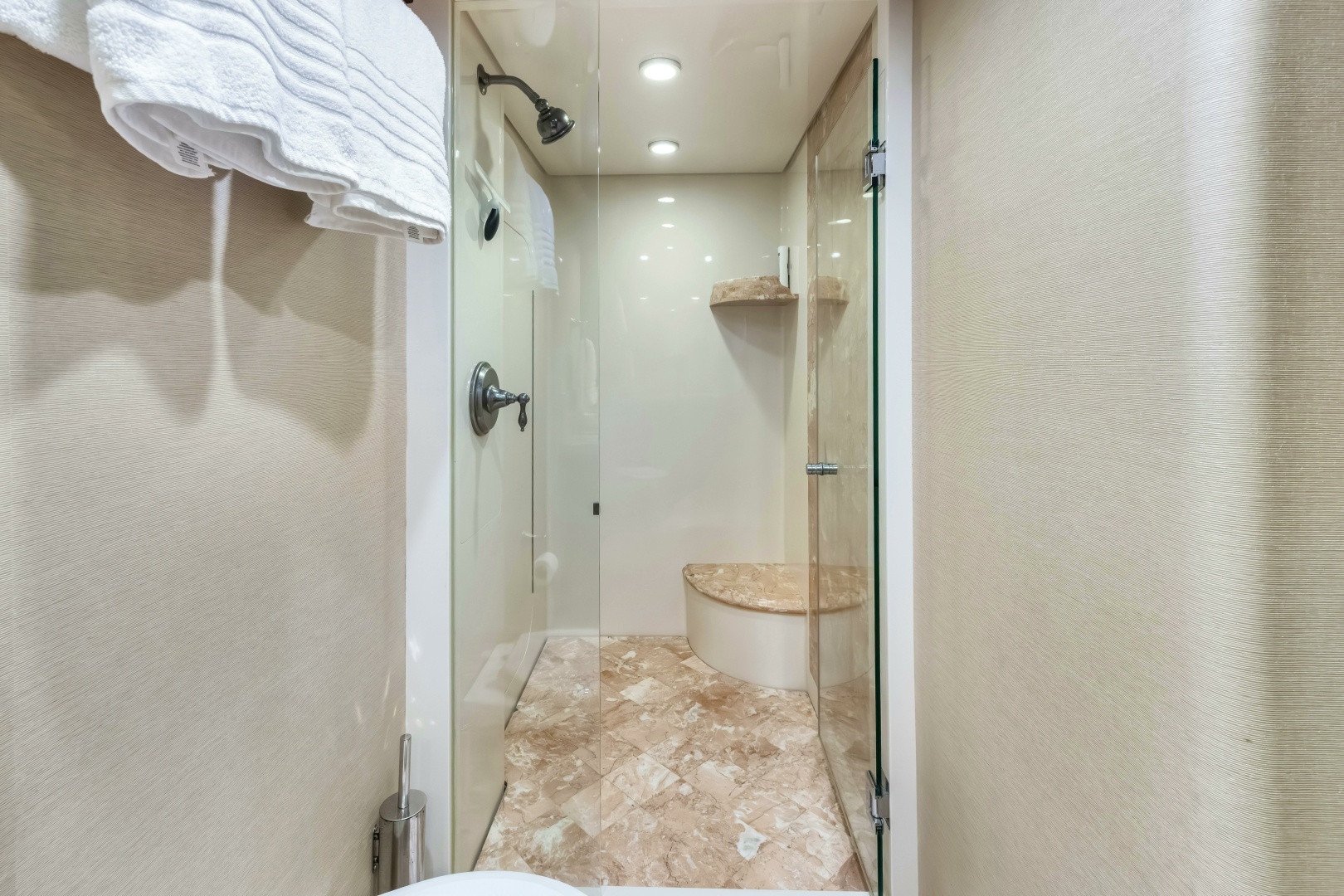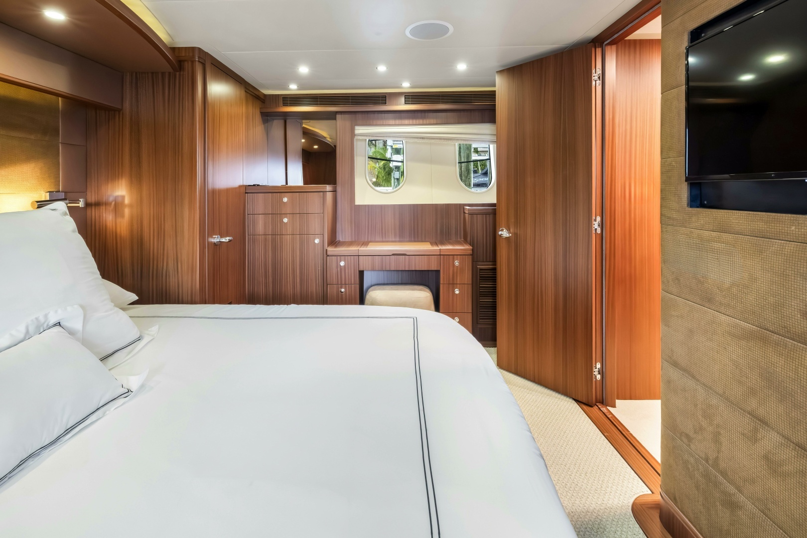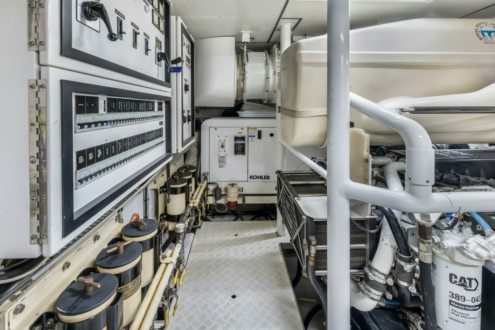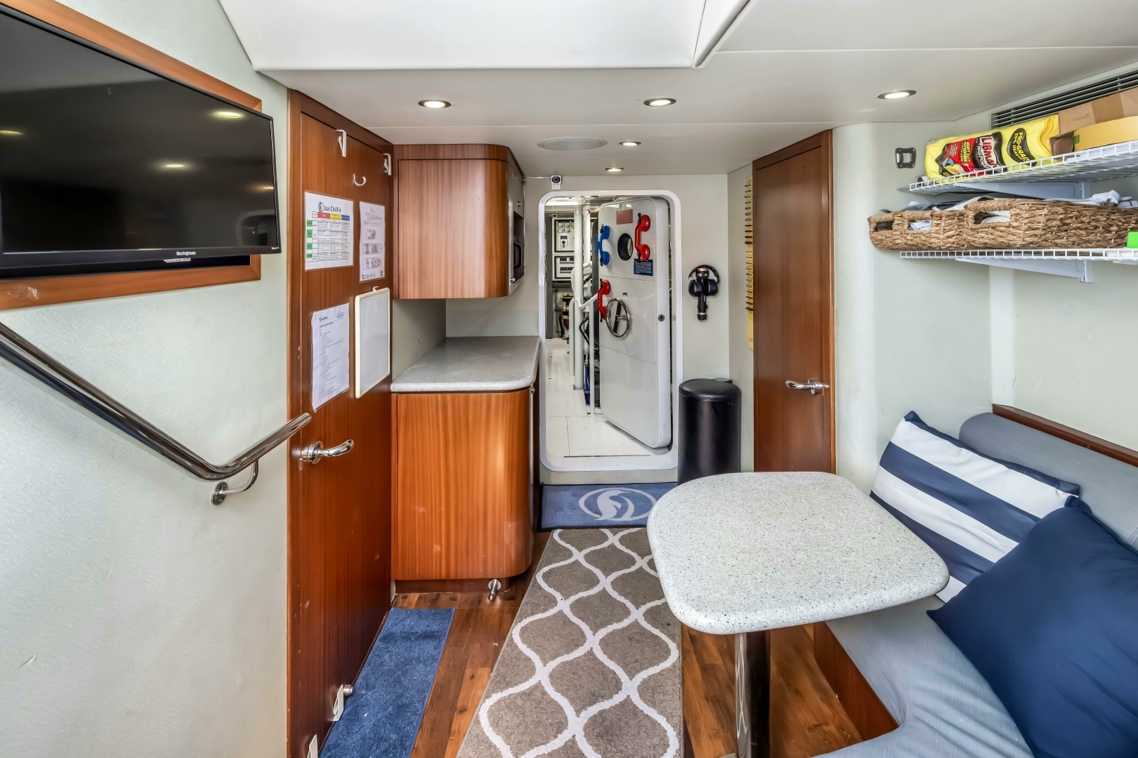 The crew quarters and engine room are accessed through a centerline transom door in the cockpit. Upon entry, you first arrive in the crew area, which includes a stateroom to port with two berths and another to starboard with a full berth. Moving further forward is the engine room, maintained to A-1 yacht-quality standards and equipped with twin Caterpillar C-32 ACERT engines, twin 32kW Kohler generators, and numerous additional “big yacht” features.