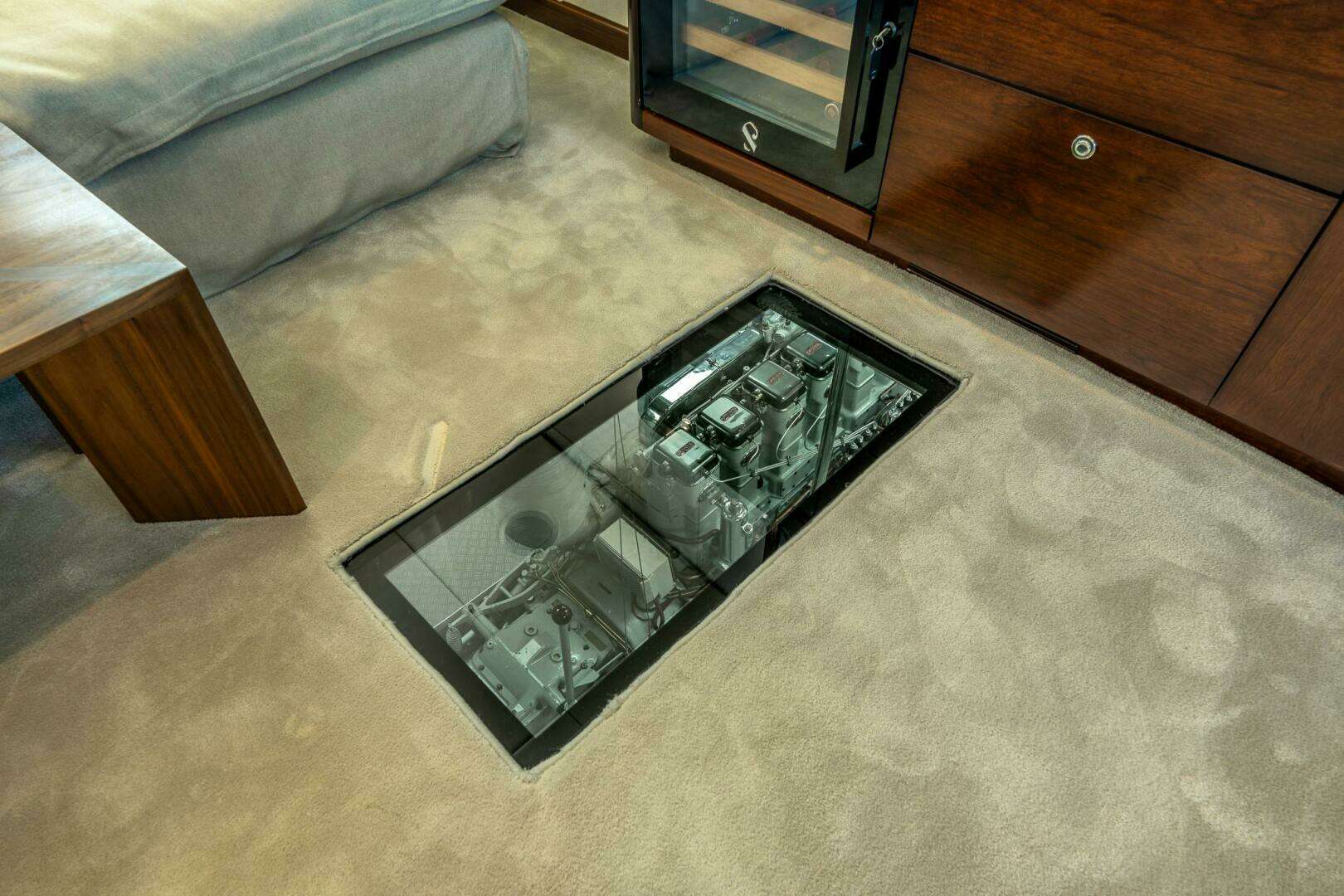 The salon has a glass panel in the floor to show the immaculately restored Gardner main engines. The engine room lighting is adapted to offer “ambiance” light in the evenings into the salon.