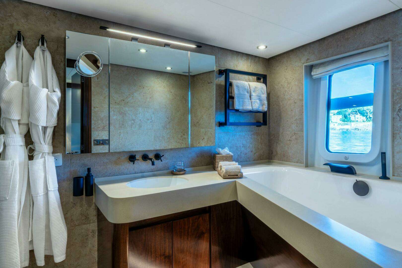 The master cabin is forward and has a queen size bed, a built-in walnut desk, settee, large drawers featuring a locker cabinet and 1 large walk-in wardrobe. 4 large hull windows flood the cabin with natural light and stunning sea views. The large owner’s bathroom was recently rebuilt with fresh stone and fittings. The ensuite offers a large 2-person bath and a large hull window with sea views. There is a separate “rain” shower and toilet.