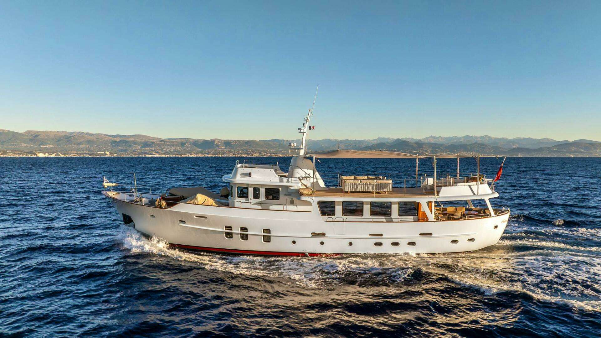 Following a sale in early 2021, Sultana underwent a series of further significant refits at Monaco Marine Beaulieu, to bring her into pristine condition for her new owner. Technically, her Gardner engines were once again rebuilt, a new generator was fitted, her lithium batteries were replaced, her sundeck received new teak, and she underwent a full repaint. Her interiors also were overhauled with a new enclosed galley being installed, a full laundry room fitted, new access to the master cabin giving space for a private crew space on the bridge, all new carpets and wall linings, along with a new AV system throughout with Starlink.