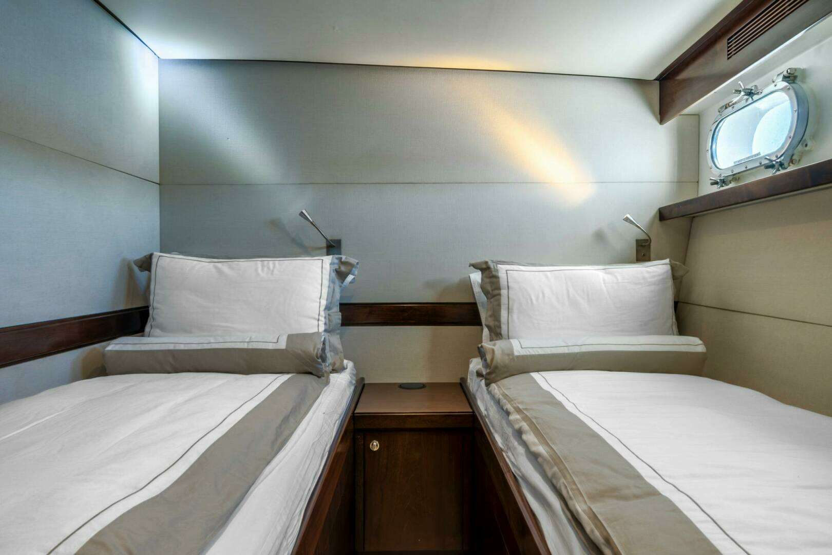 Sleeps 6 in 3 guest cabins plus 4 crew in 2 cabins. Sultana was previously configured with 4 guest cabins, one of which has been converted to a dedicated laundry room.