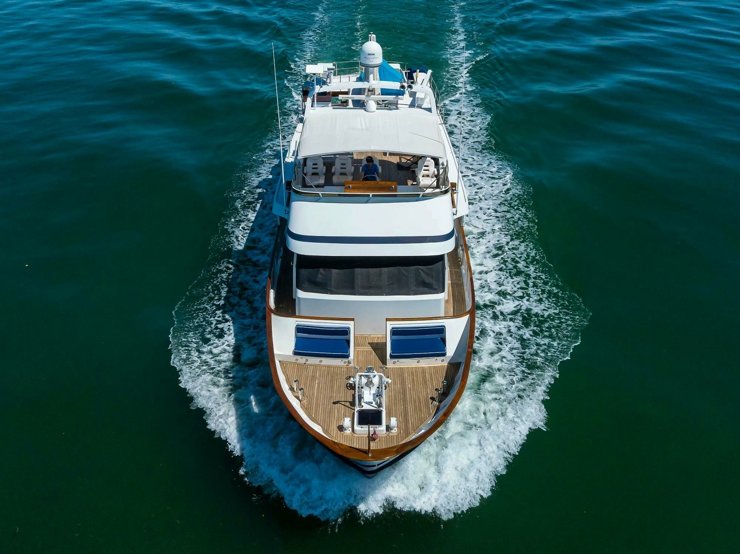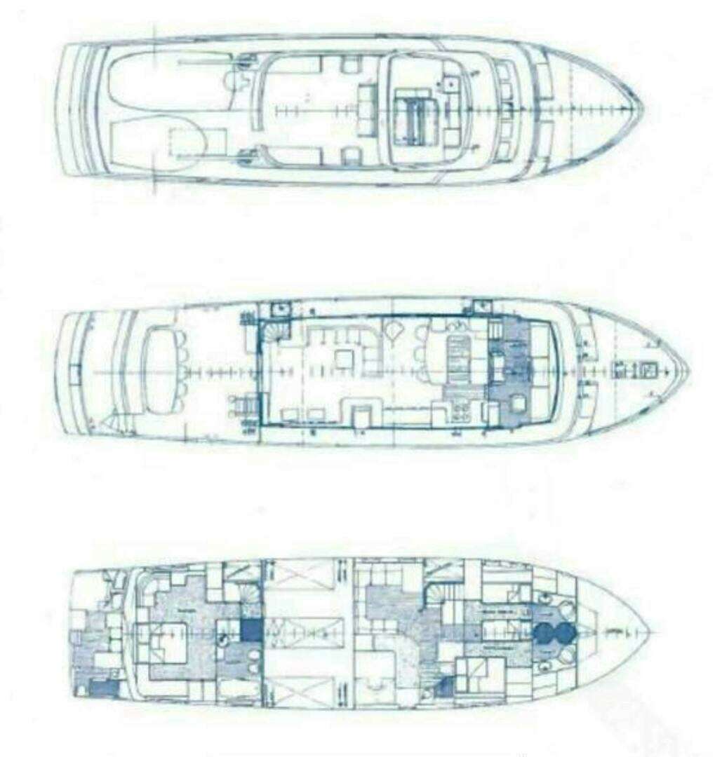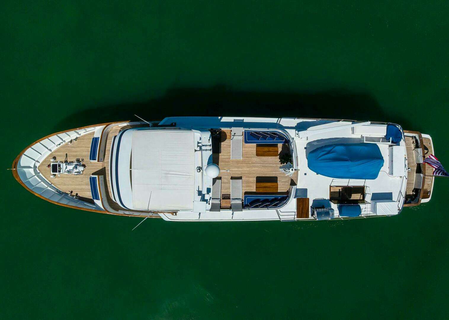 The hull sides were fully repainted Flag Blue in 2020. During the comprehensive 2021 refit, the bottom was sandblasted and recoated with new bottom paint, the flybridge tender deck received new paint and non-skid, and interior paneling was refreshed and repainted white. Additional bottom paint coatings were applied in 2023 and again in 11/2024.Construction