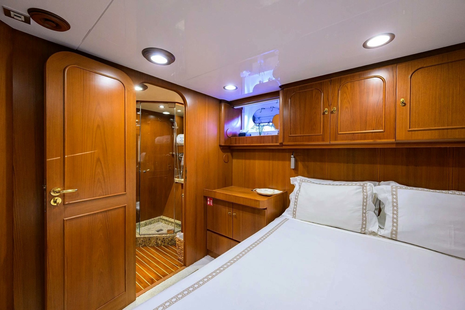 - Accommodates 10 guests in four staterooms, with separate crew quarters for two, plus a flex room convertible to a queen berth for additional crew or guests.