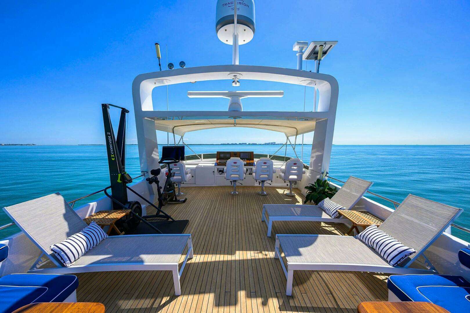 - Large aft deck with oversized bar and teak dining table seating 12.