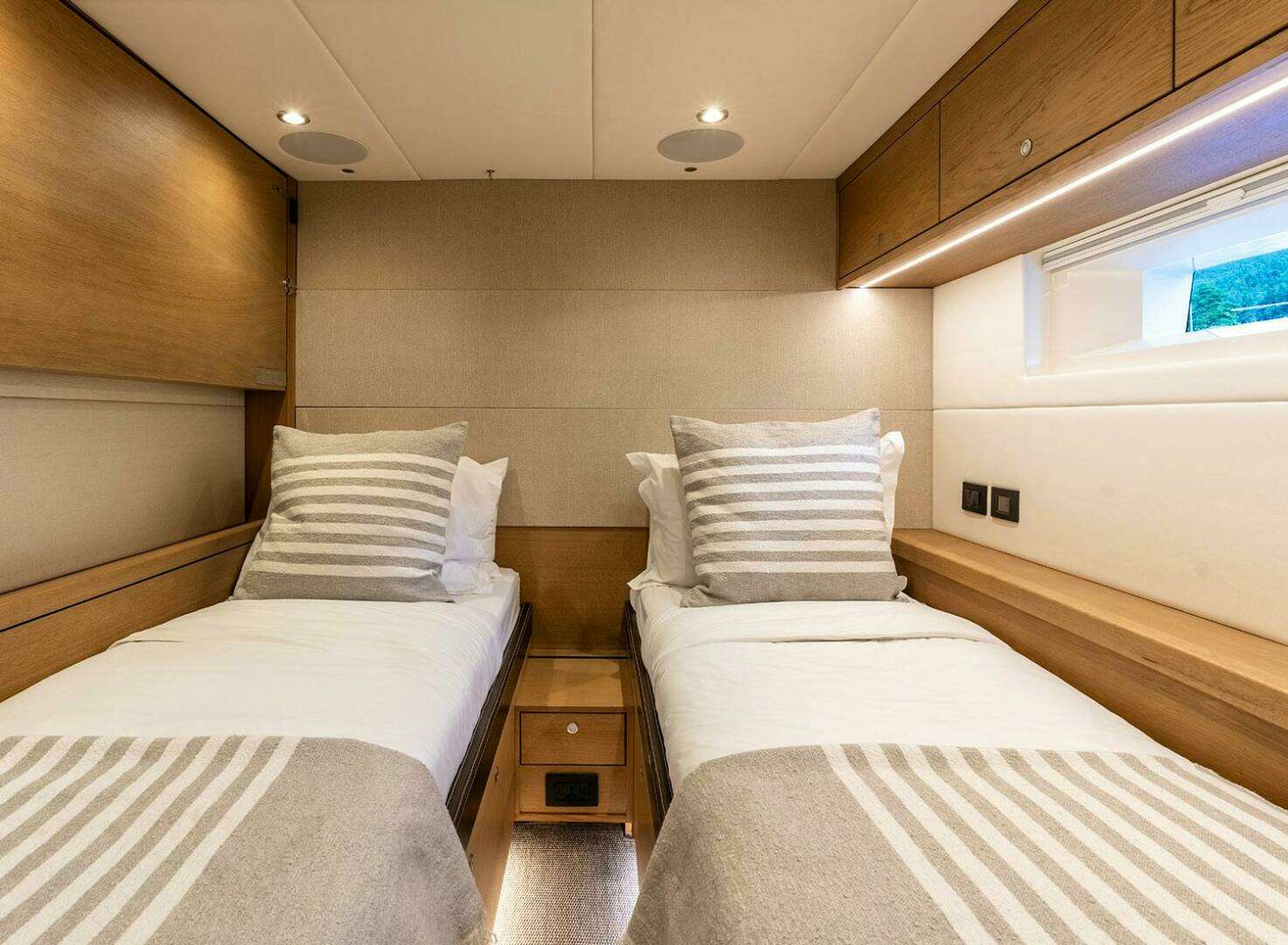 Accommodations are well-appointed, designed to host up to eight guests in four ensuite cabins. The full-beam master suite aft includes a private study and ensuite bathroom. The large double guest cabin to starboard, the twin guest cabin to port, and the oversized guest cabin forward of the saloon all offer generous space, comfort, and privacy. Crew accommodations forward include a large captain’s double and additional crew bunks, sharing a dedicated head and shower.