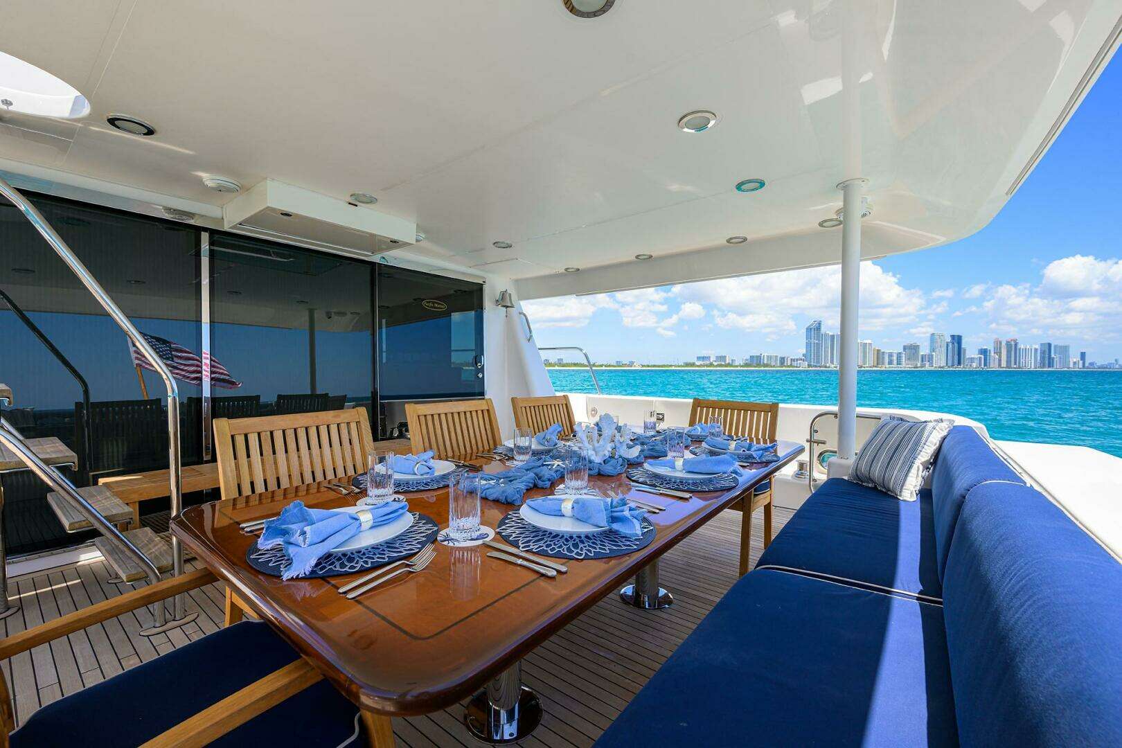 This open layout allows seamless entertaining between the salon, aft deck, and formal dining area.