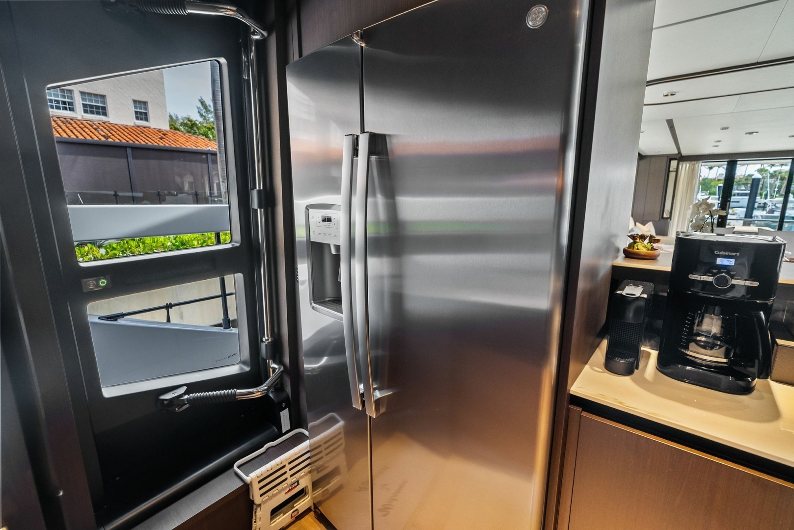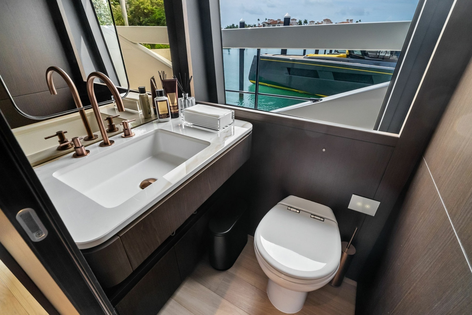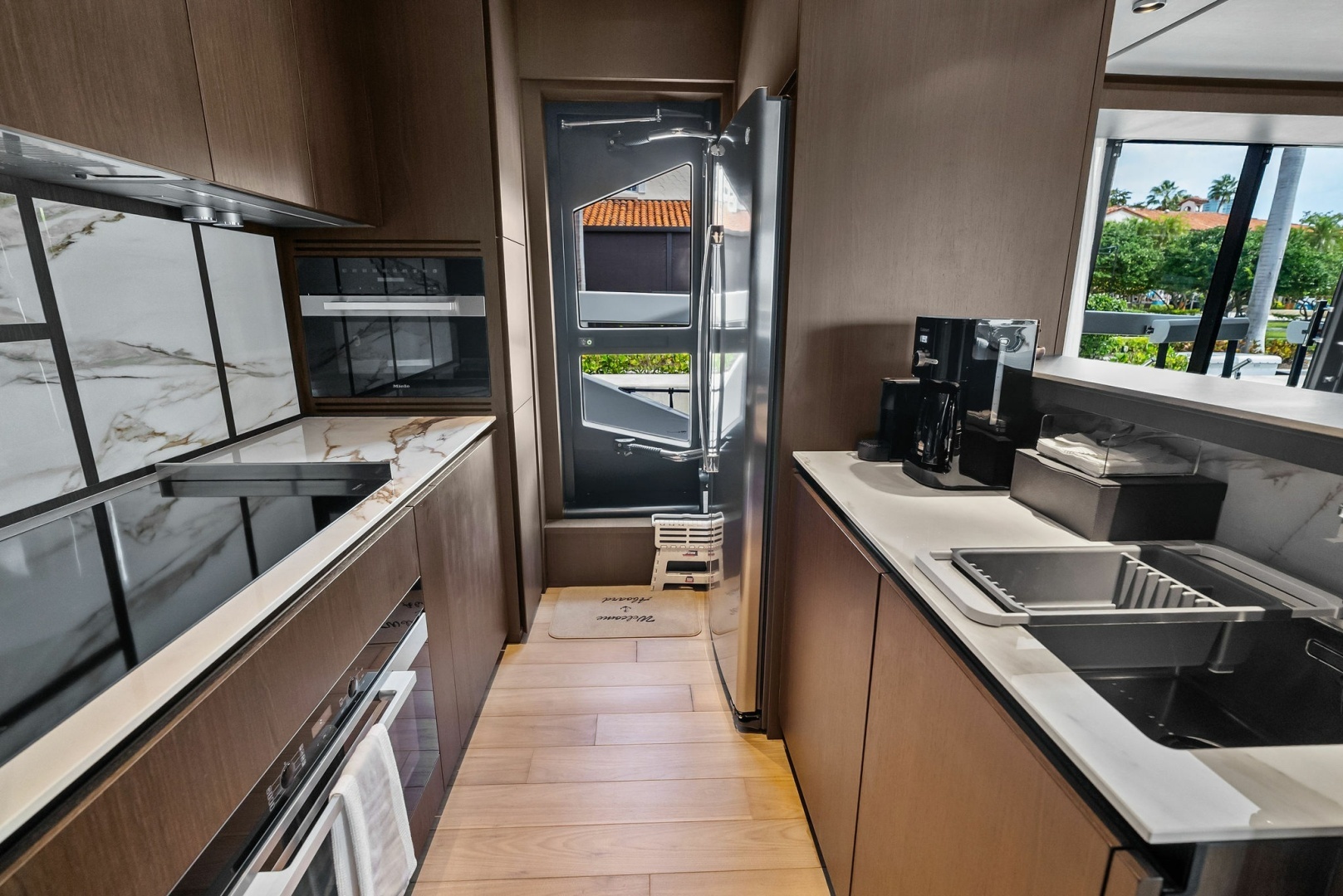 Her sleek exterior lines and expansive glazing create a strong visual presence while flooding the interior with natural light. The main deck features a beautifully appointed salon with panoramic windows, seamless indoor‑outdoor flow, and refined finishes throughout. A formal dining area and a fully equipped galley provide both practicality and sophistication for extended cruising.