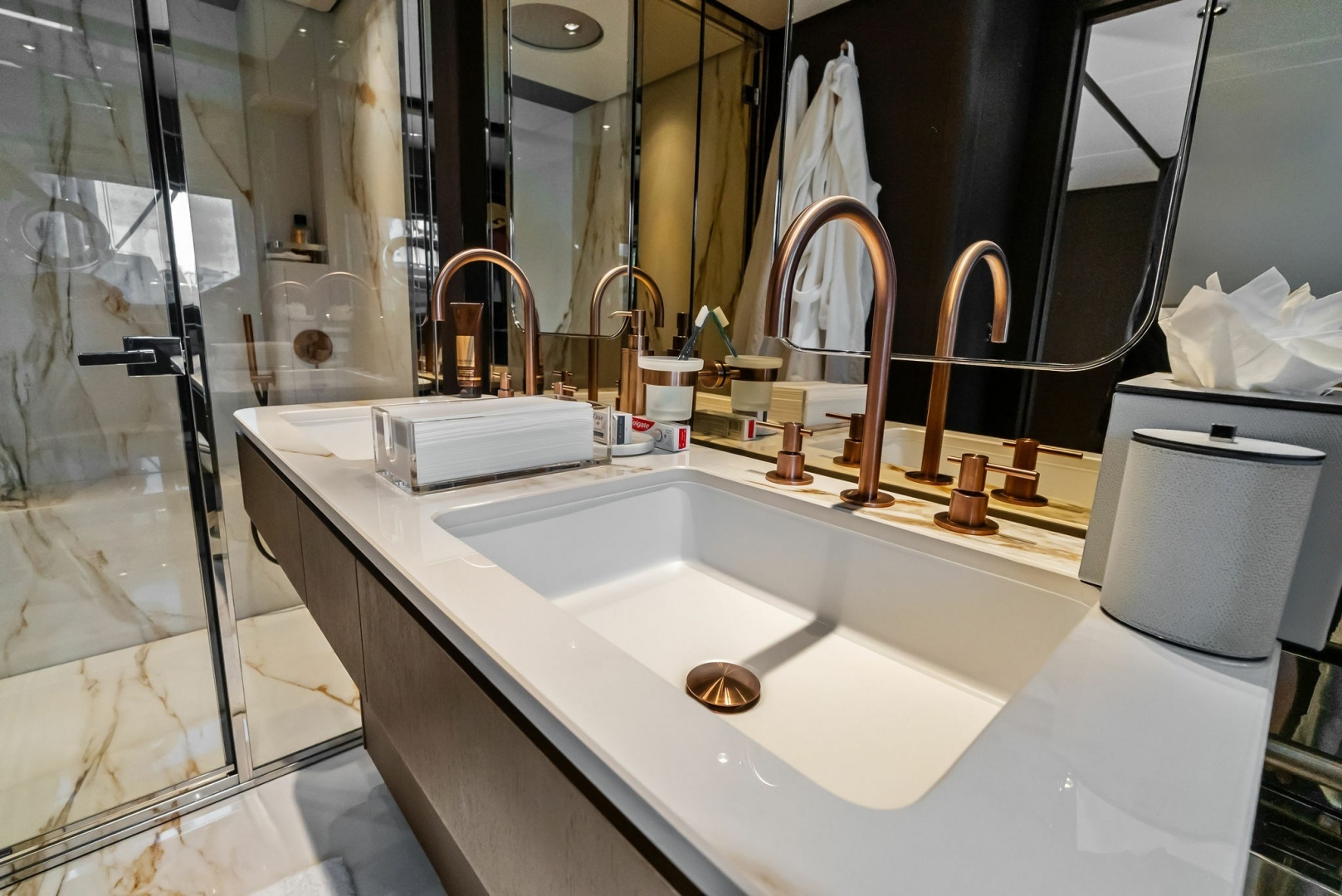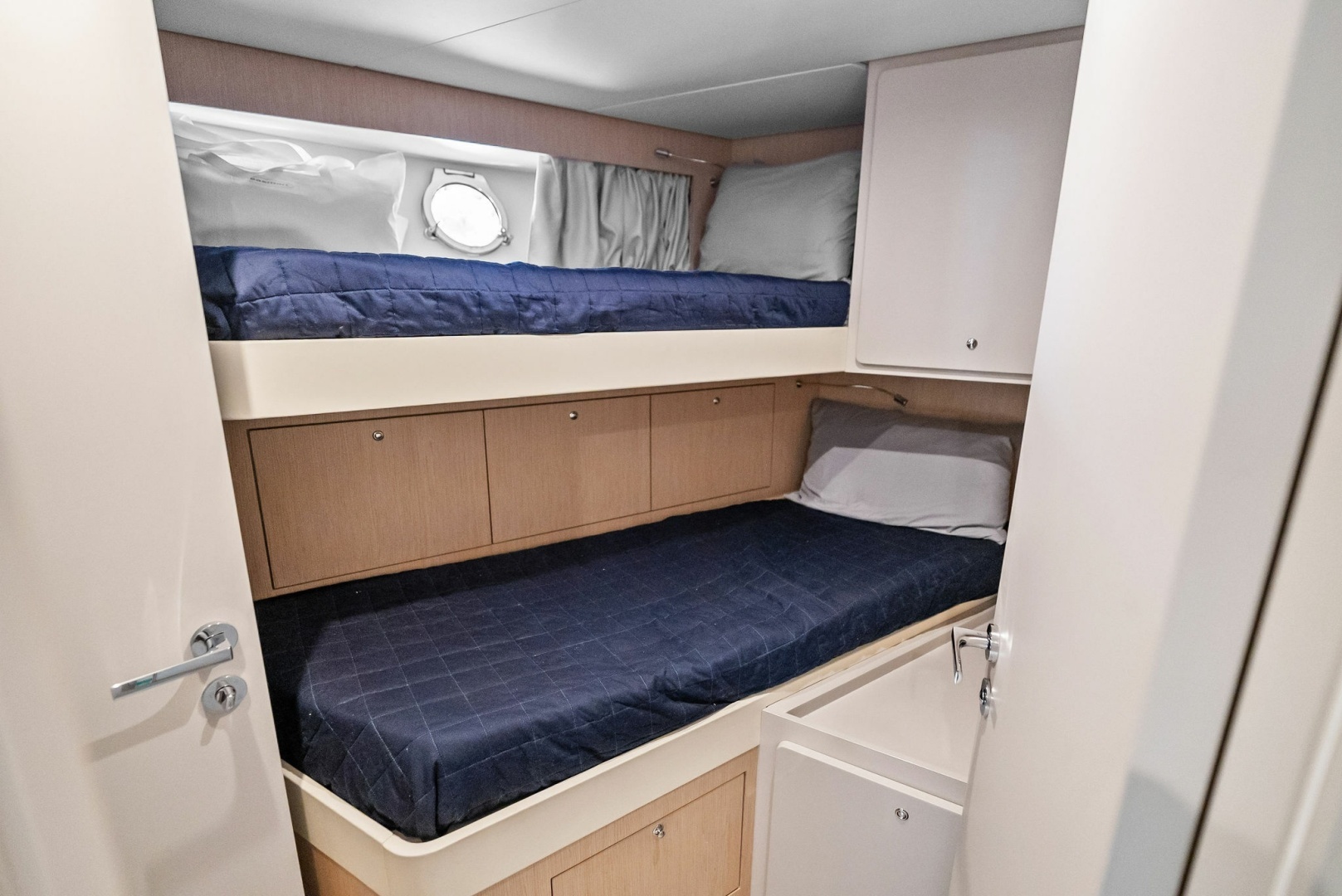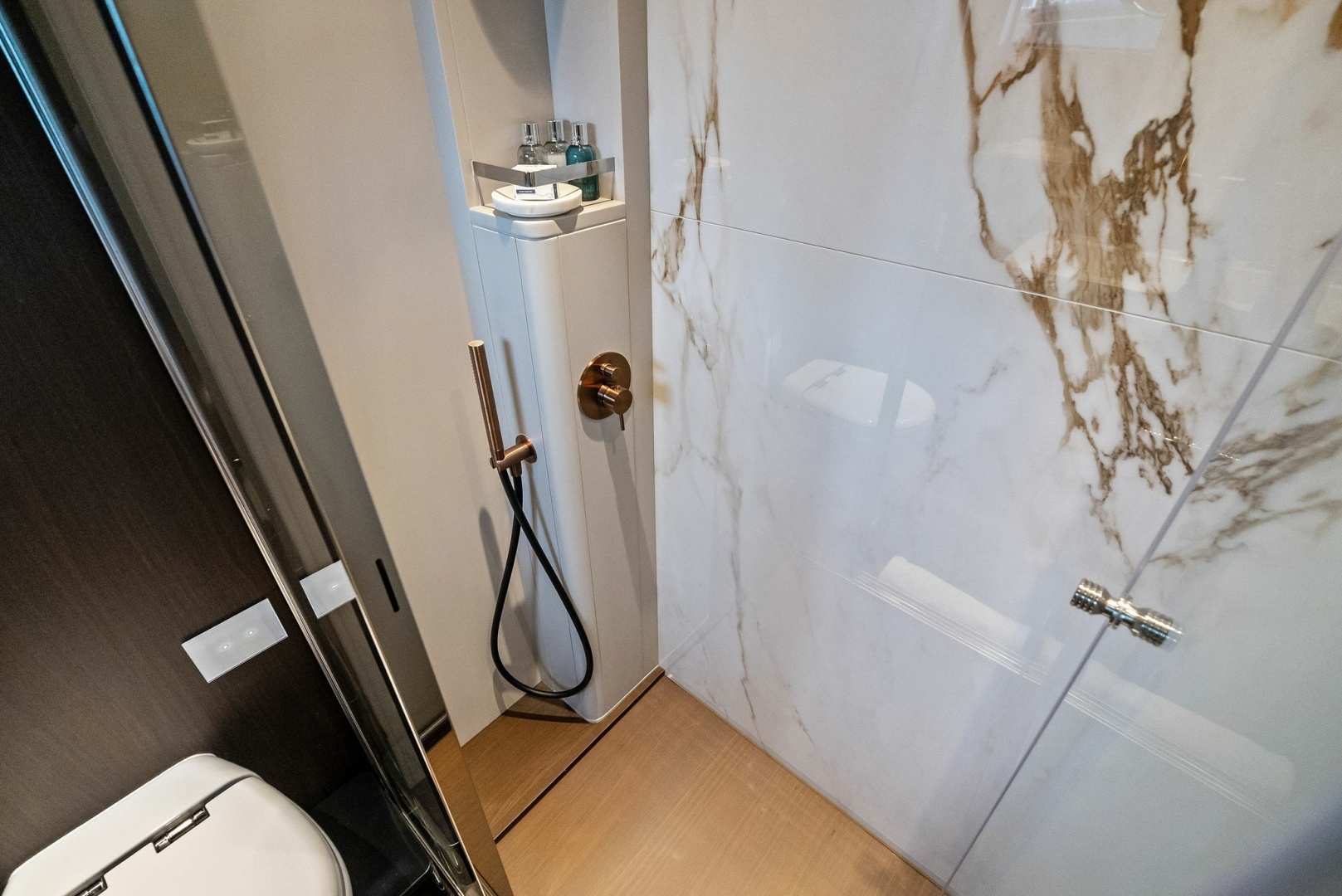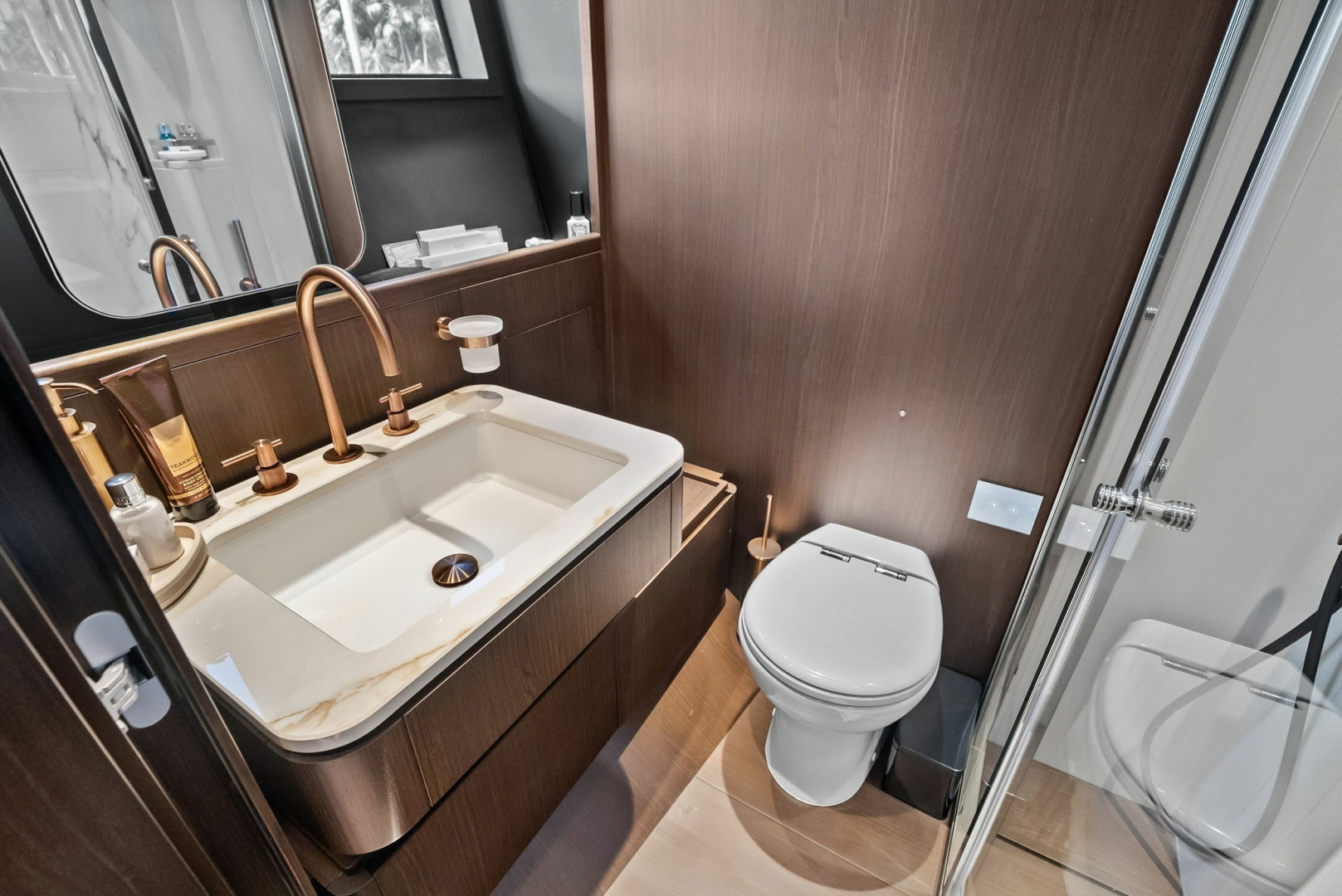 LADY F accommodates guests in a spacious four‑stateroom layout, including a full‑beam master suite that delivers exceptional volume, refined décor, and a private en‑suite head. Each stateroom is thoughtfully designed to maximize comfort and privacy.