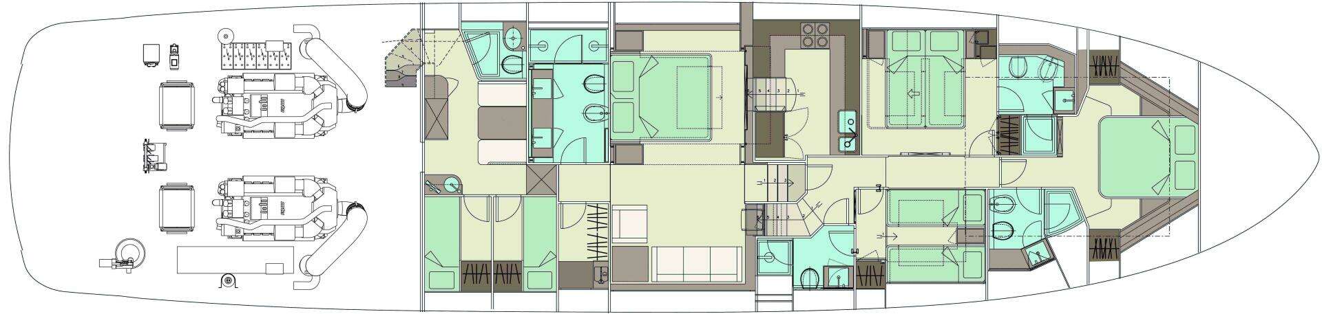 Interior & Accommodations The interior blends Italian luxury with modern functionality, illuminated by new LED lighting and abundant natural light.