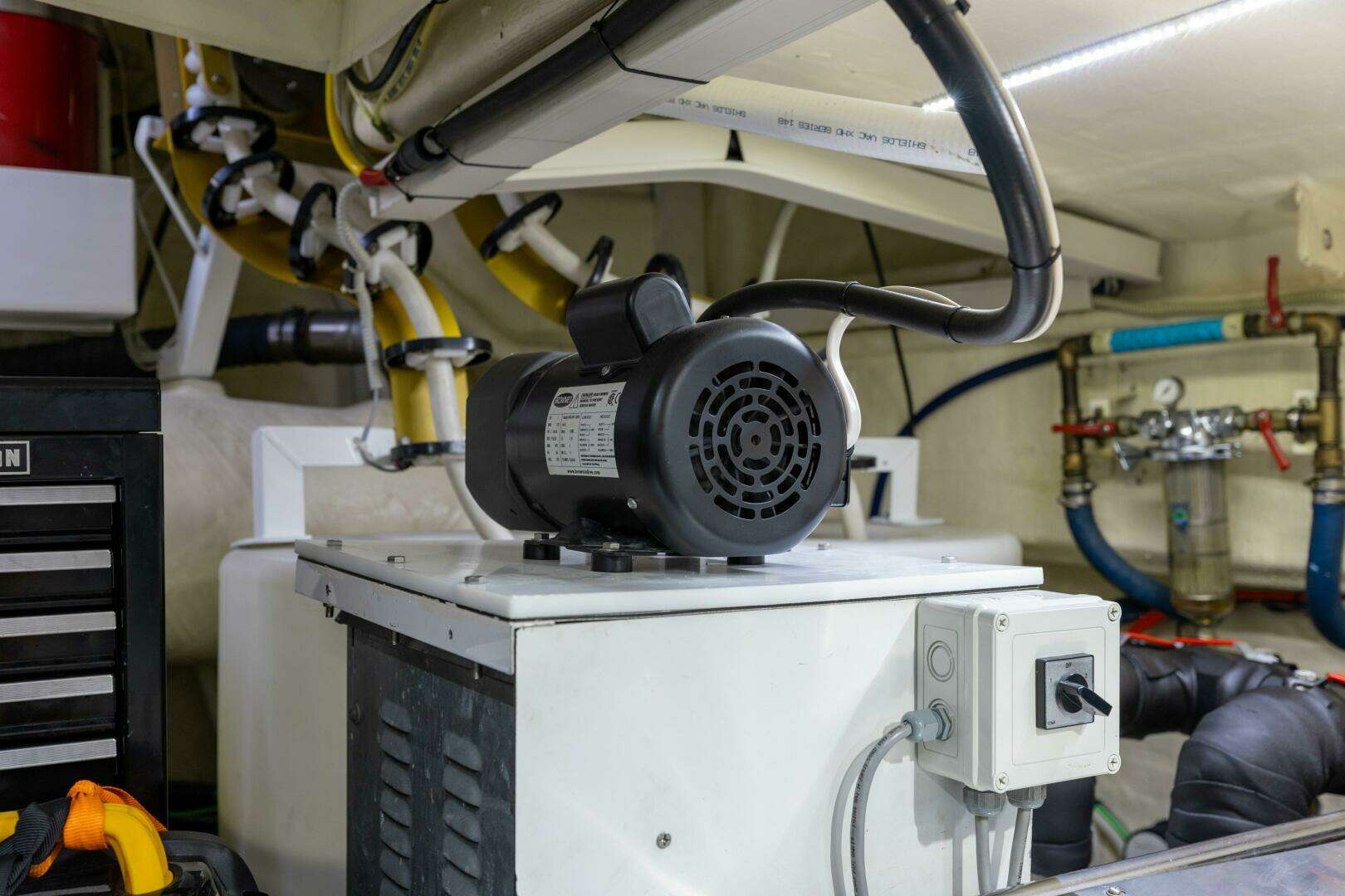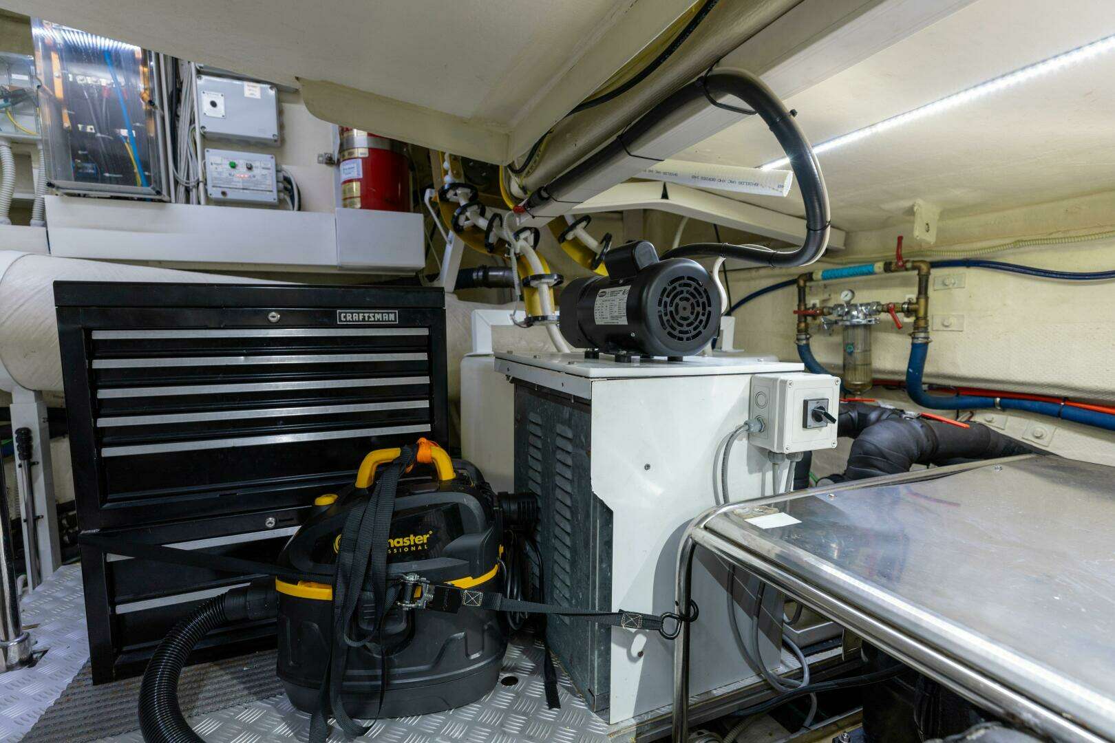 Fixed Brownies dive compressor in the engine room with transom quick-connects.
