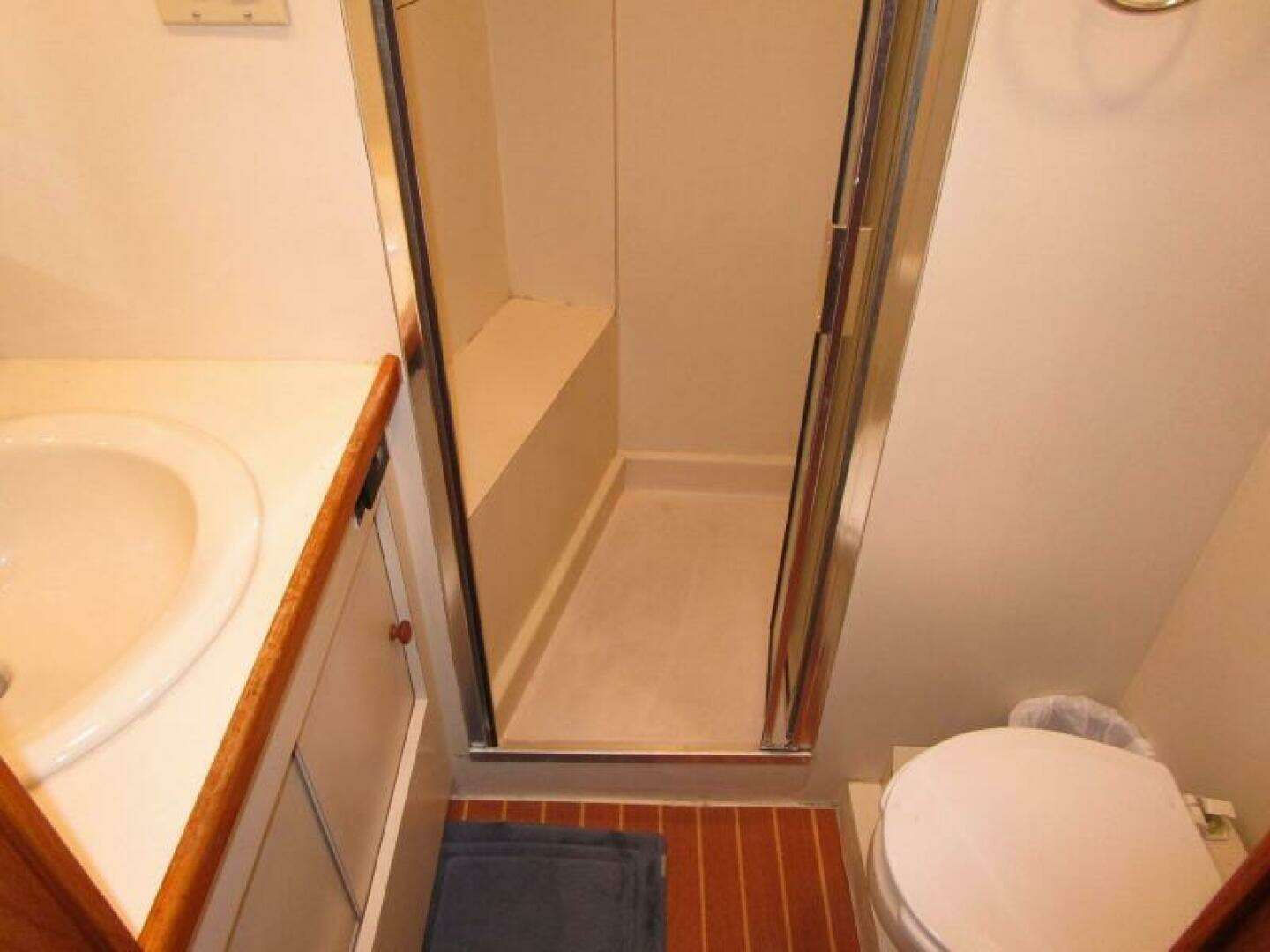 To starboard is an ensuite twin lower berth cabin with a stall shower.