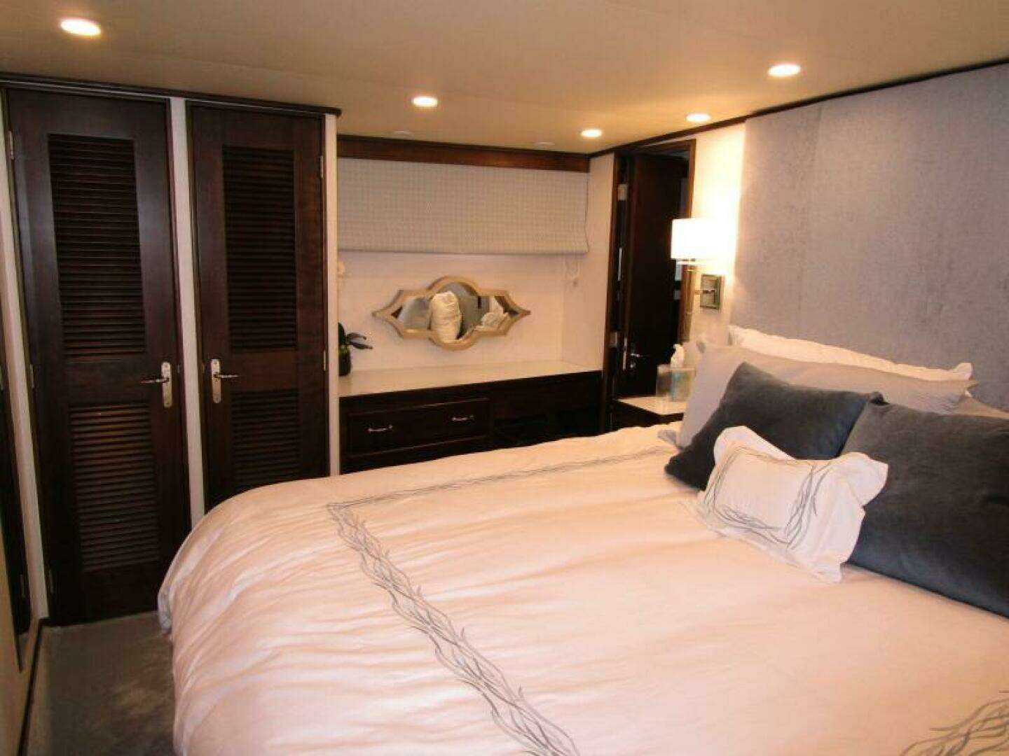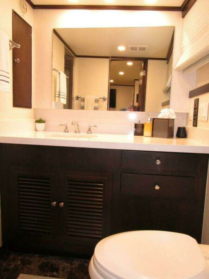 Below decks the king size Master suite with separate His and Hers Heads is aft, the port side having a shower to starboard a Jacuzzi tub.