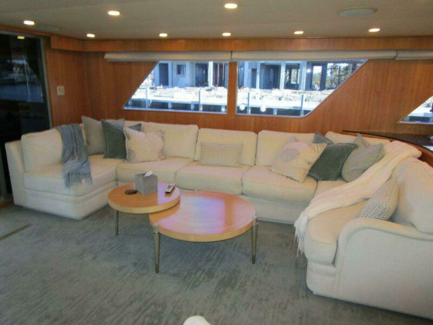 Aft of the Salon through sliding doors is the large enclosed Aft Deck with built-in seating, three teak chairs all around an oval table. A 55” LG TV and access to the original lazarette area also in this area.