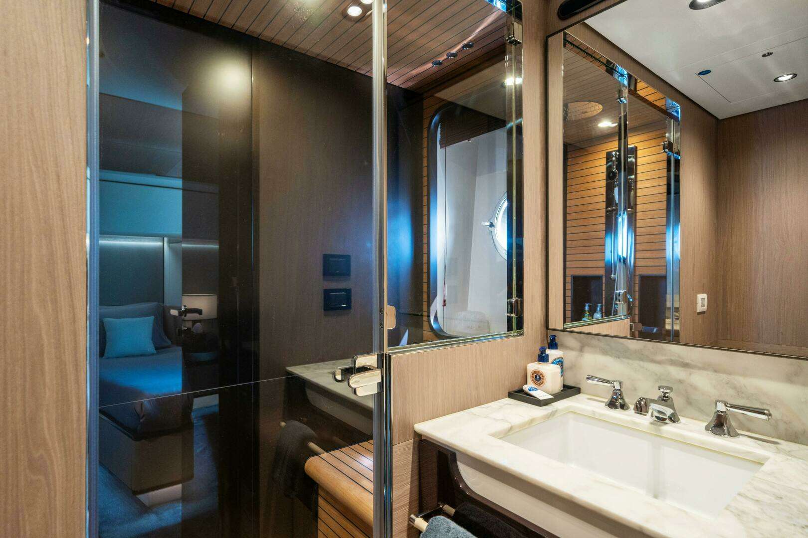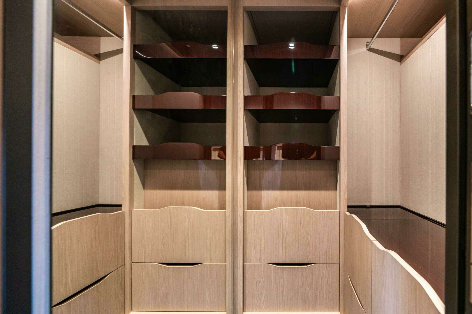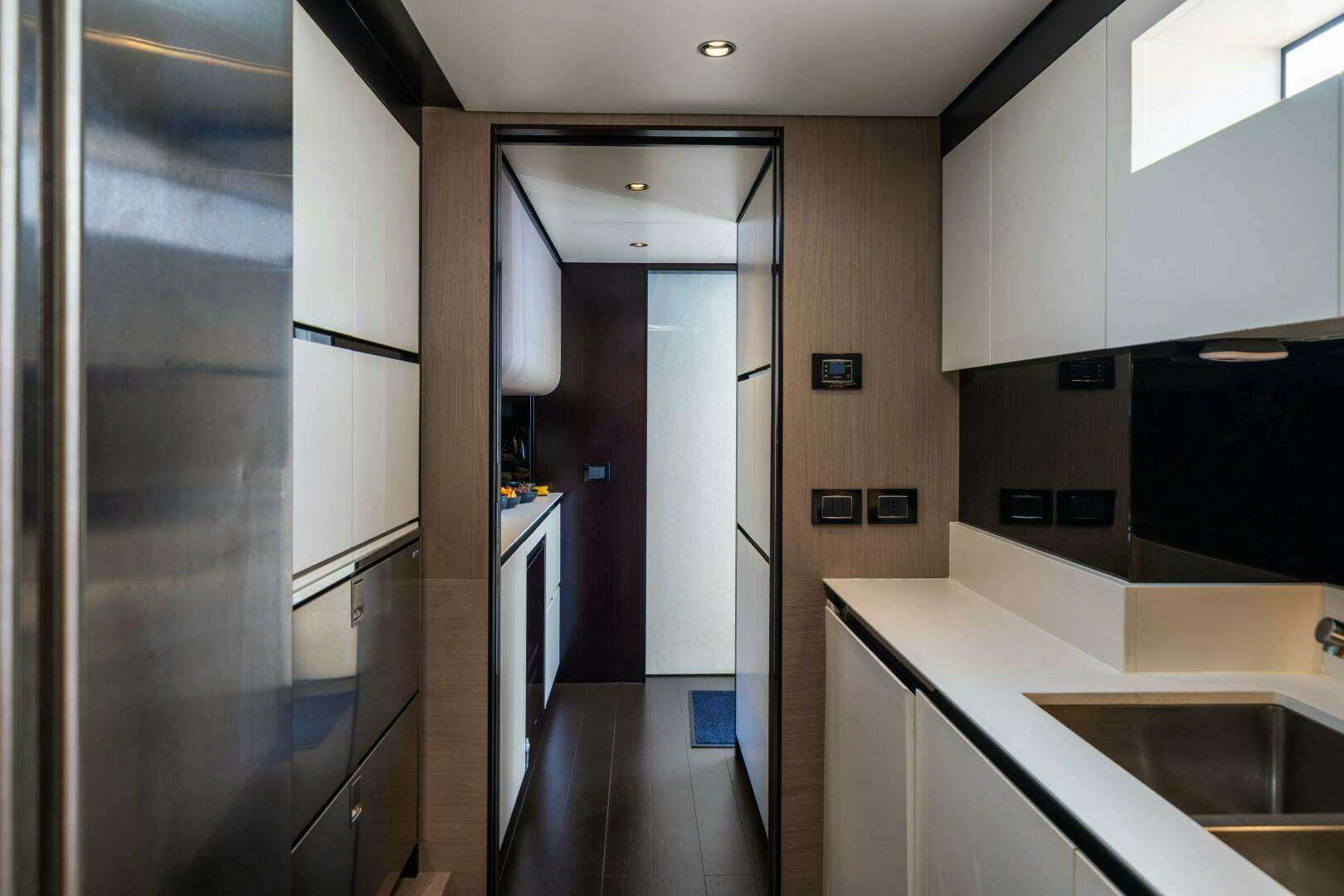 Galley- Located on port side, the access is through concealed sliding door located forward of the pantry. This layout allows full isolation of this area from the saloon and dining area reserved for the owner and his guests.