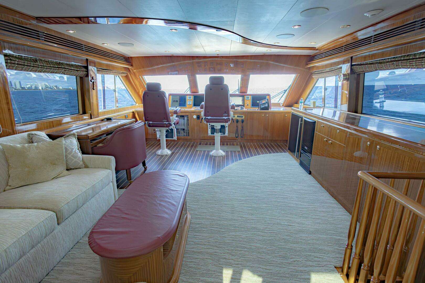 This well-designed gathering space is designate for masculine appeal. Utilizing rich tones and leather upholstery we have created a warm and fabulous space for entertaining guests. The helm station is forward with an impressive instrument console, Stidd chairs and a ships desk.