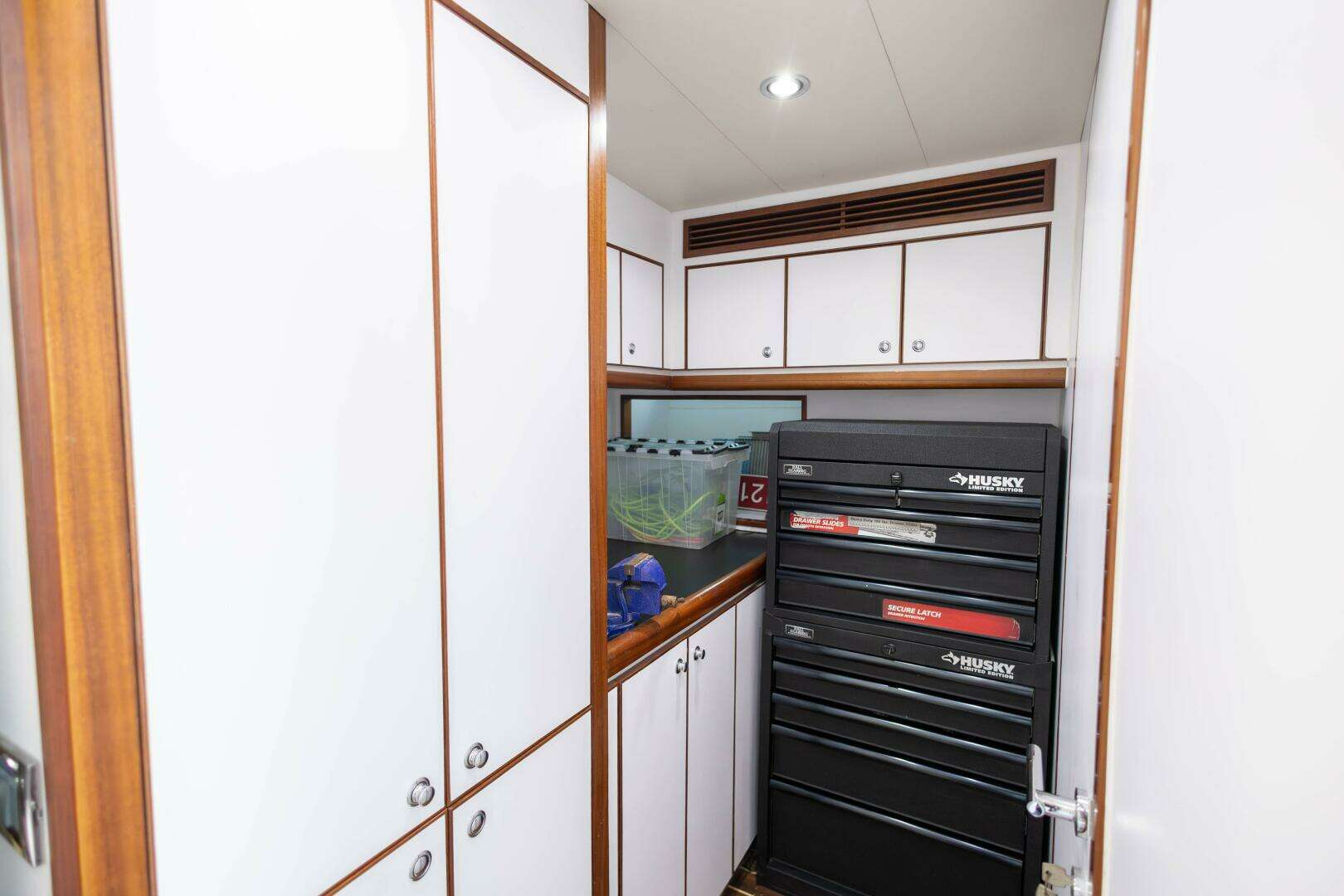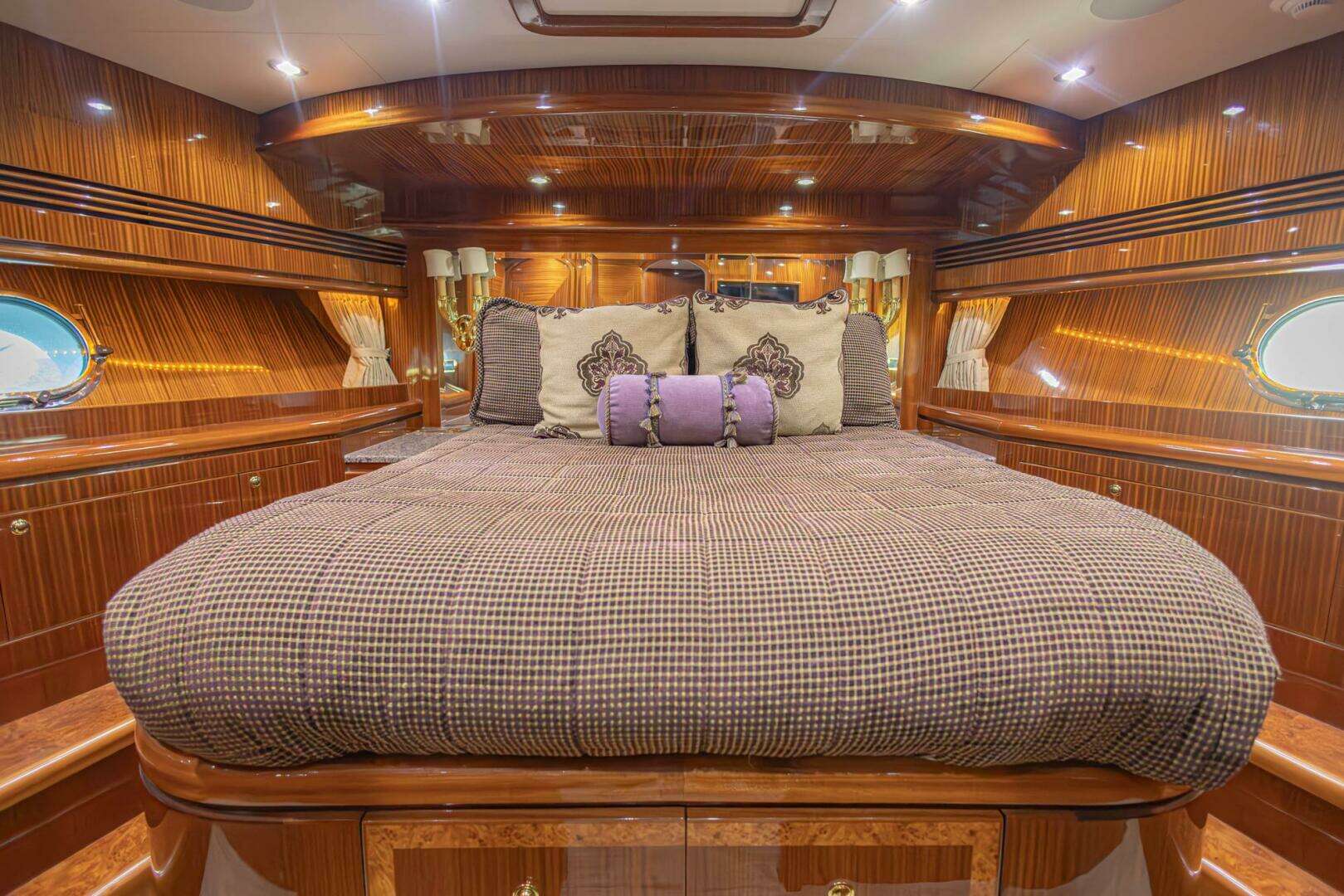 The entrance doors to the master are stunning with a Gloss Sapeli frame and Clear mirror inserts. The King-Sized headboard top roll upholstery with nightstand topped in Green Butterfly granite on both sides. The master head has a granite shower, towel warmer, and a tub. The Engine room can be accessed from both the crew area after and off the master stateroom.